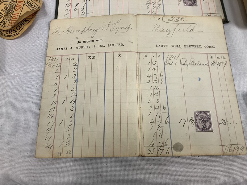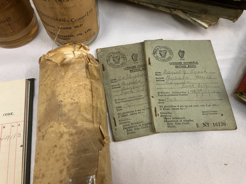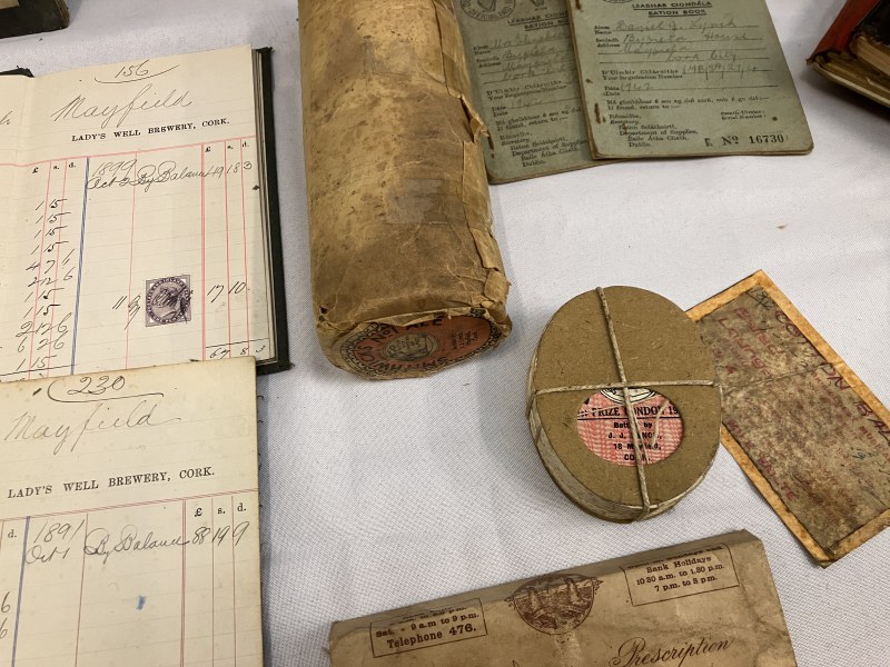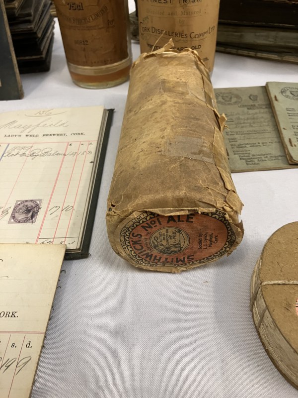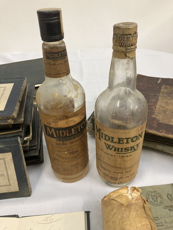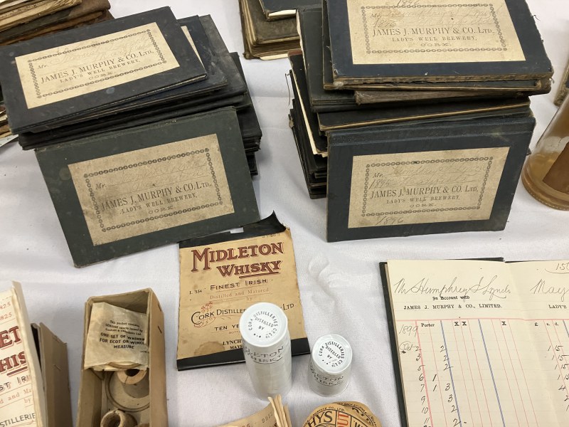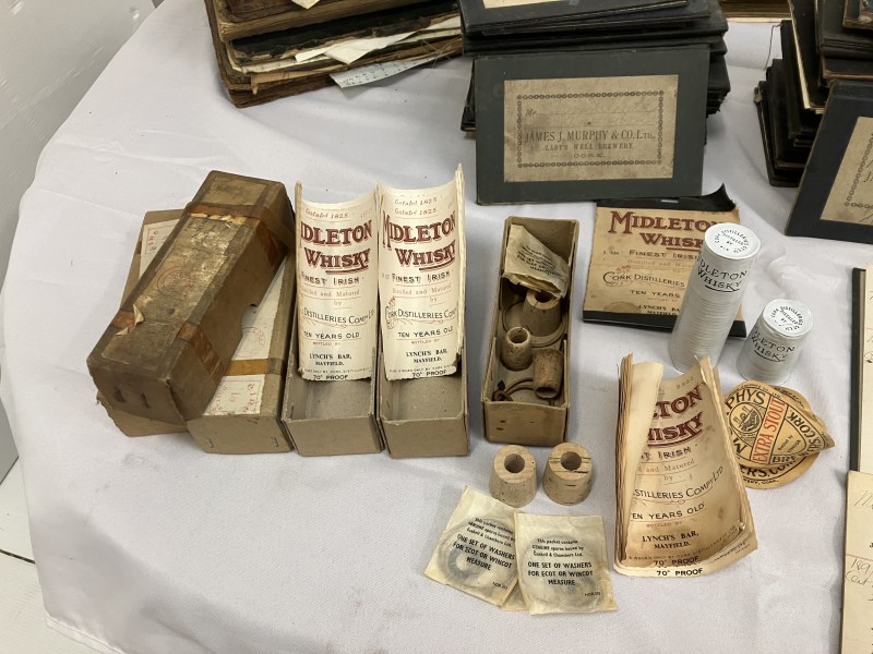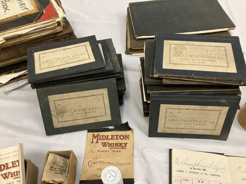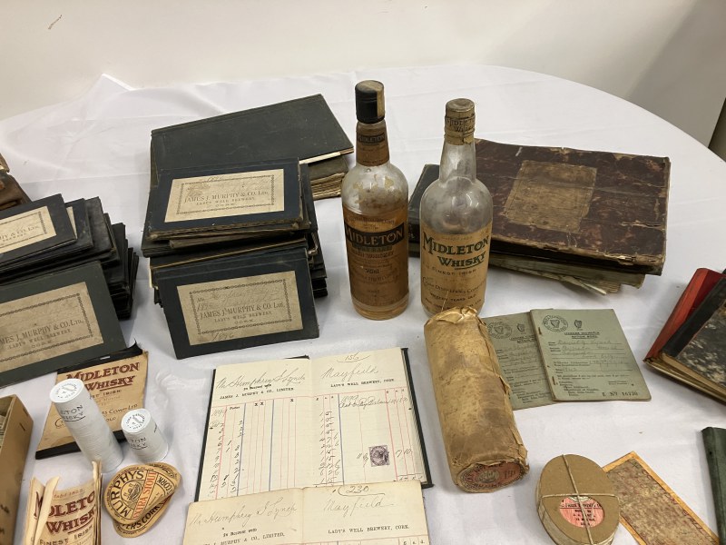 Interesting lot of old pub memorabilia to include ledgers, stock books, old labels, 2 Midleton whiskey bottles, etc.