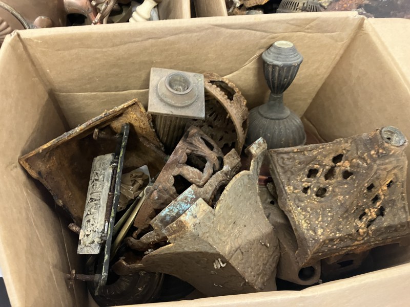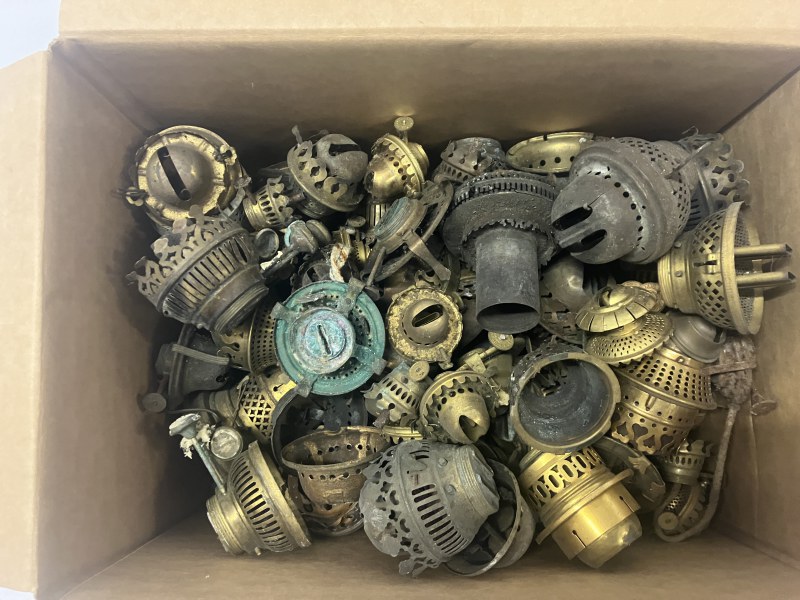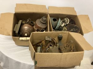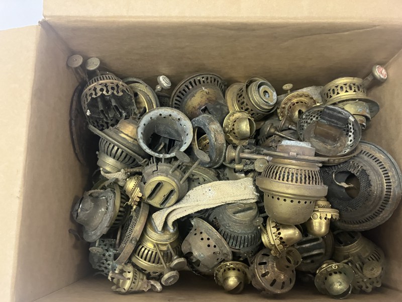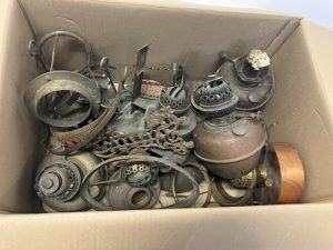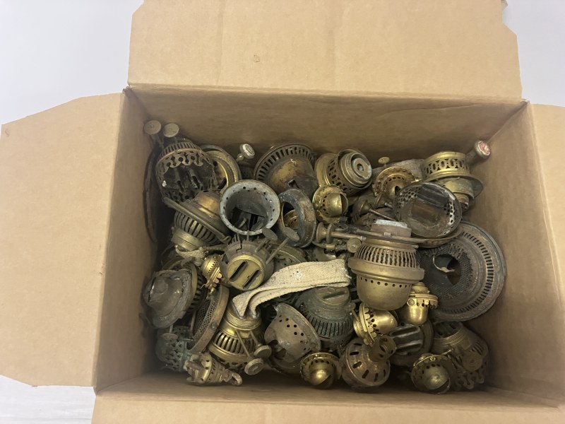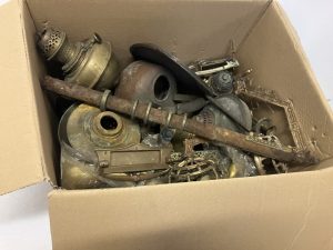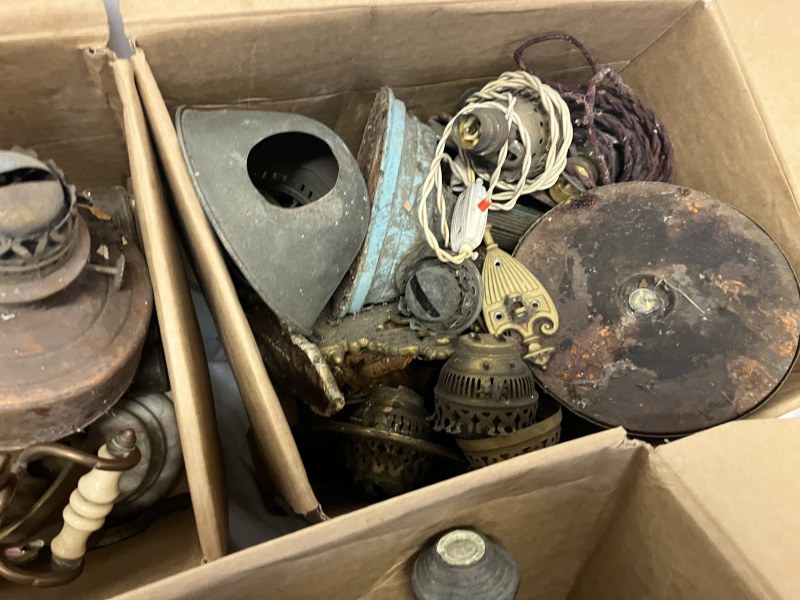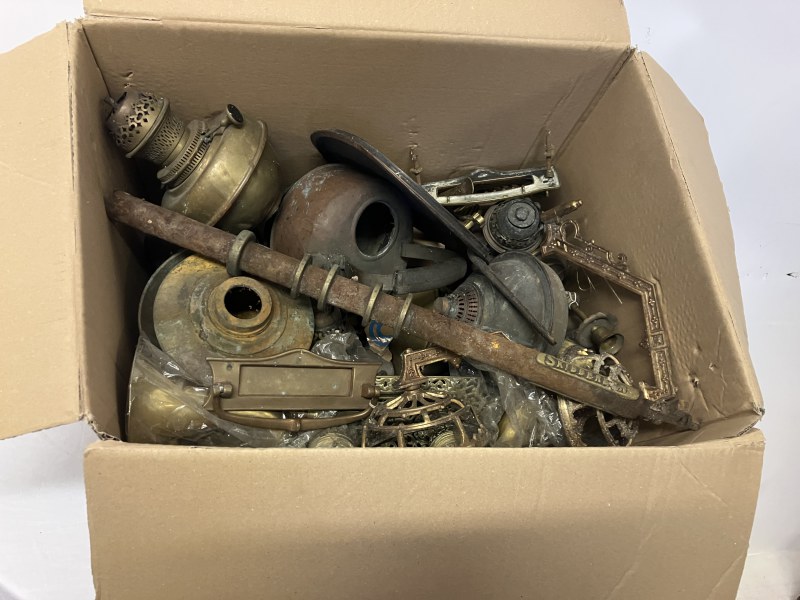 Large box of old brass ware to include oil lamp parts plus cast iron probably railway lever stamped Skibbereen & Drimoleague Junction.