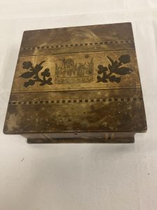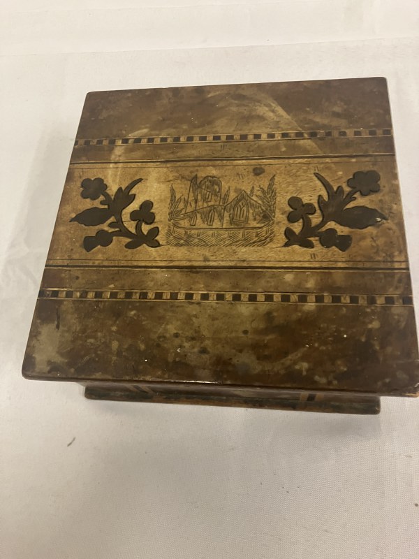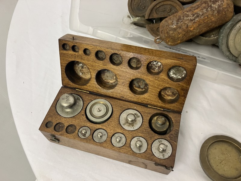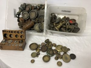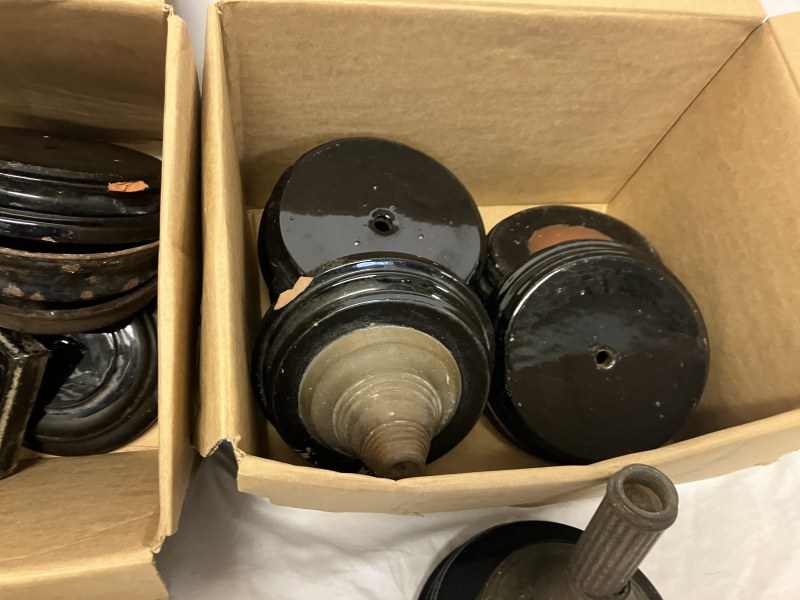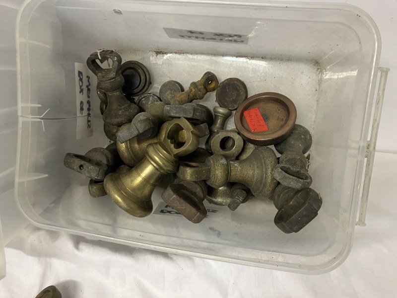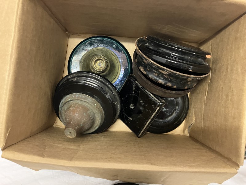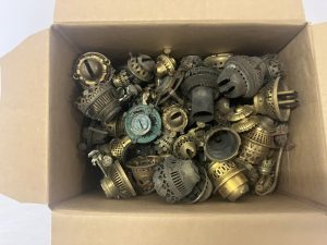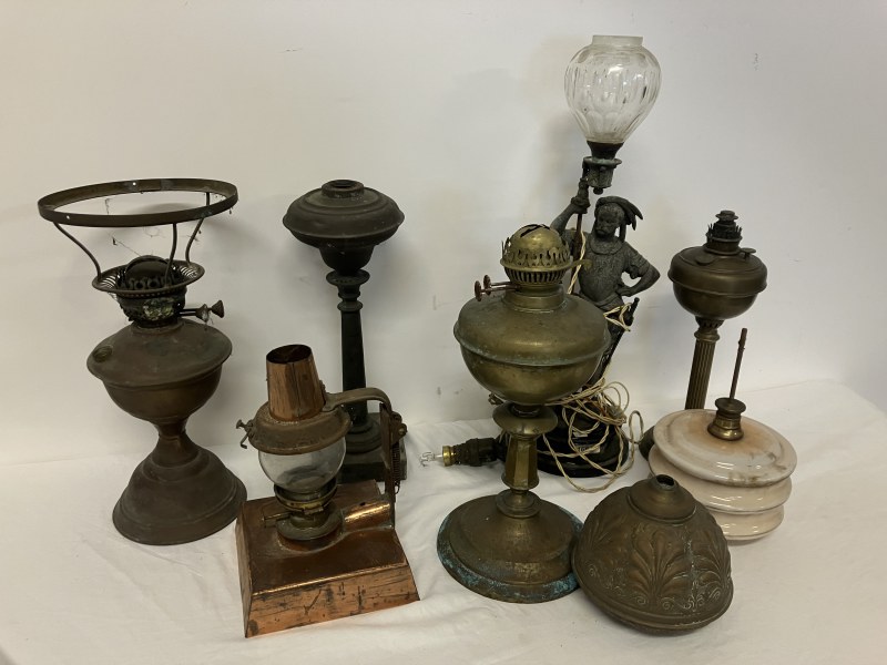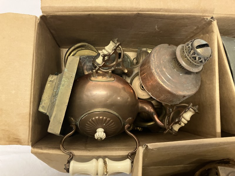 Large box of old brass ware to include oil lamp parts plus cast iron probably railway lever stamped Skibbereen & Drimoleague Junction.