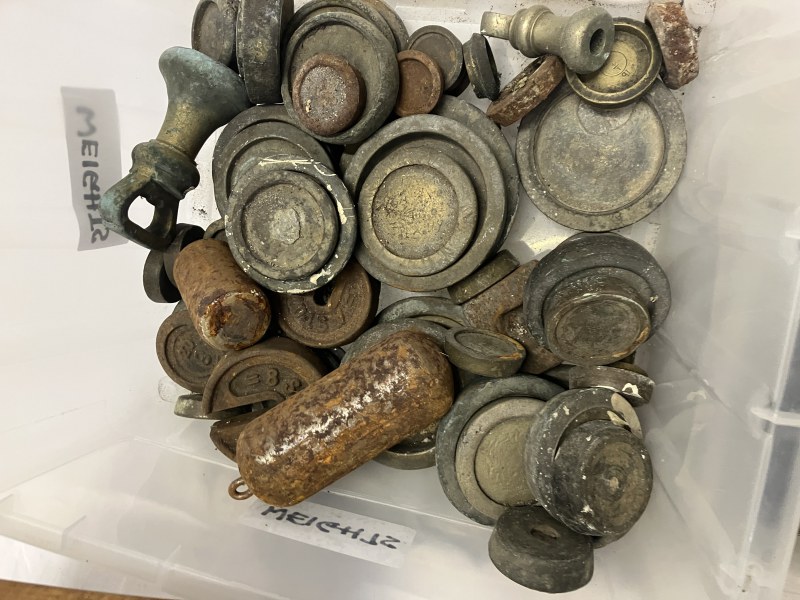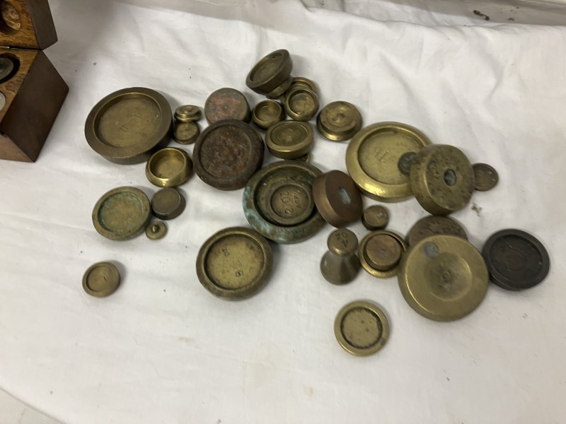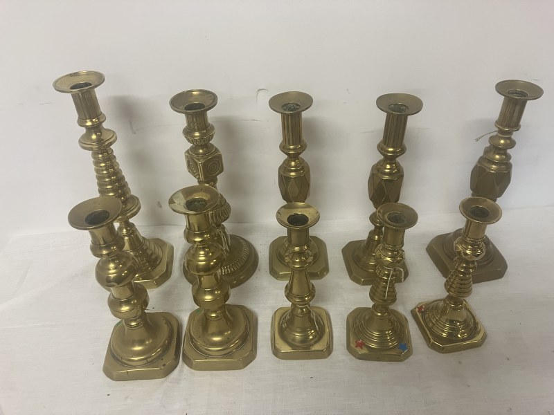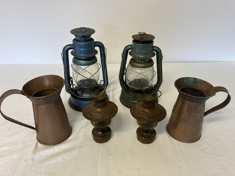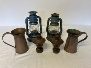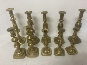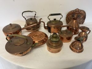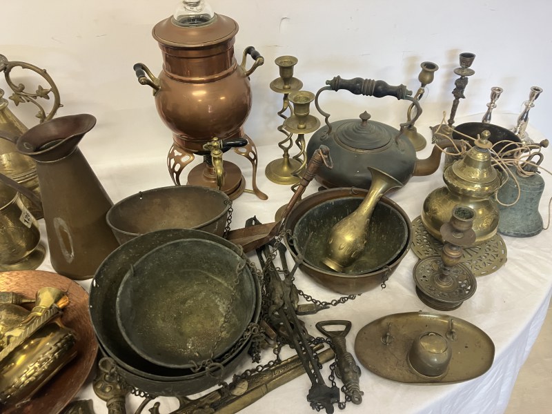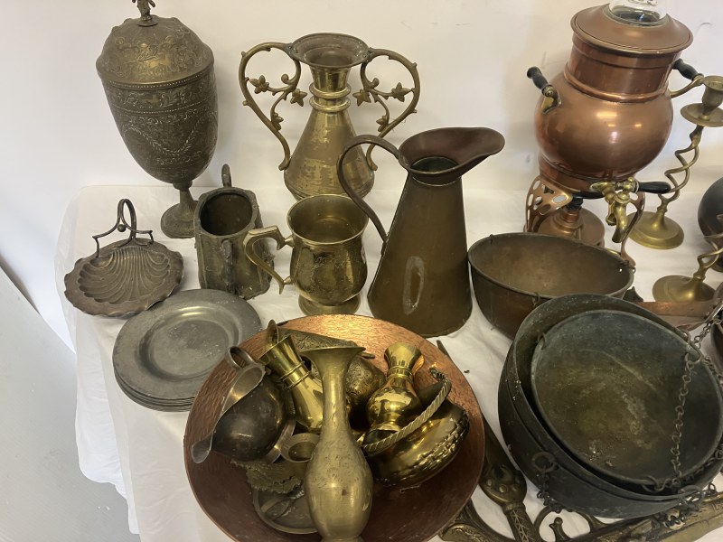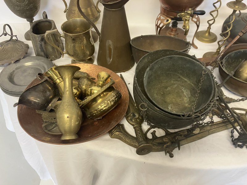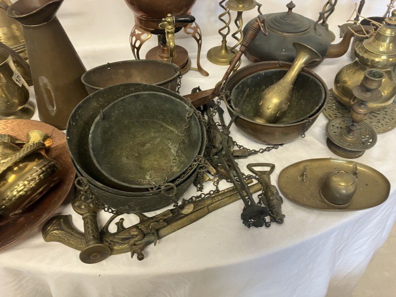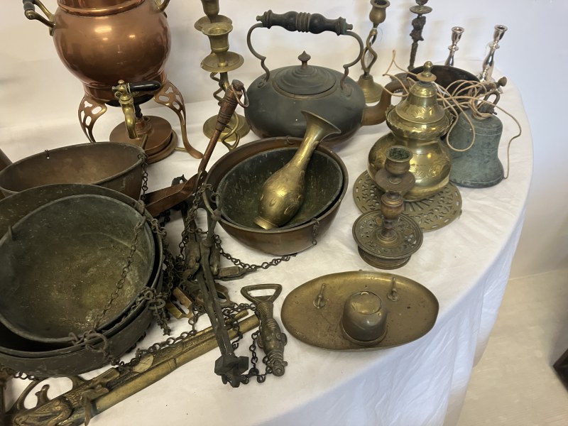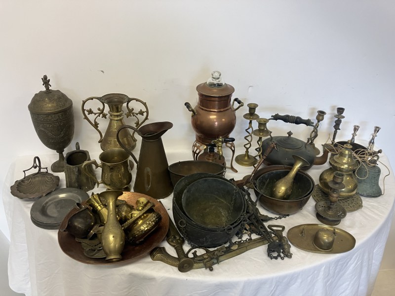 Large lot of copper and brass ware, hanging scales, candlesticks, vases, etc. (see photos)