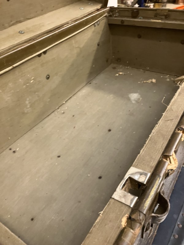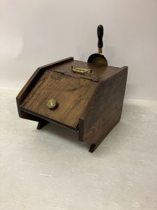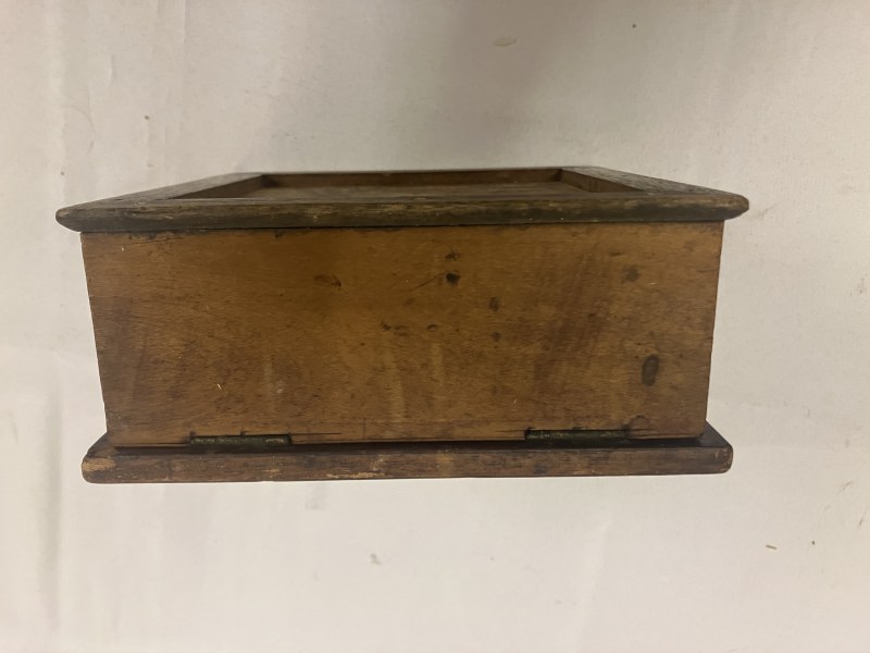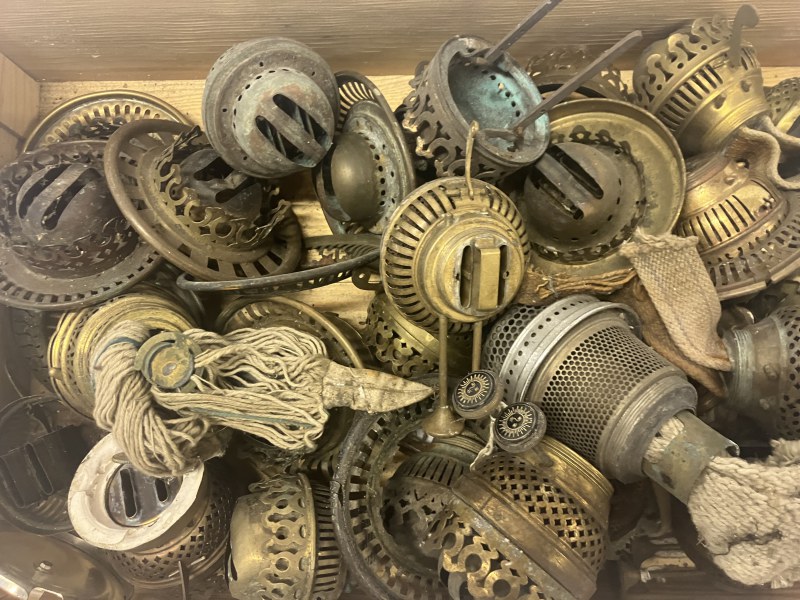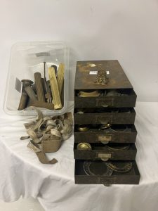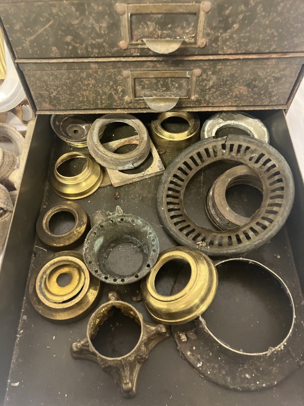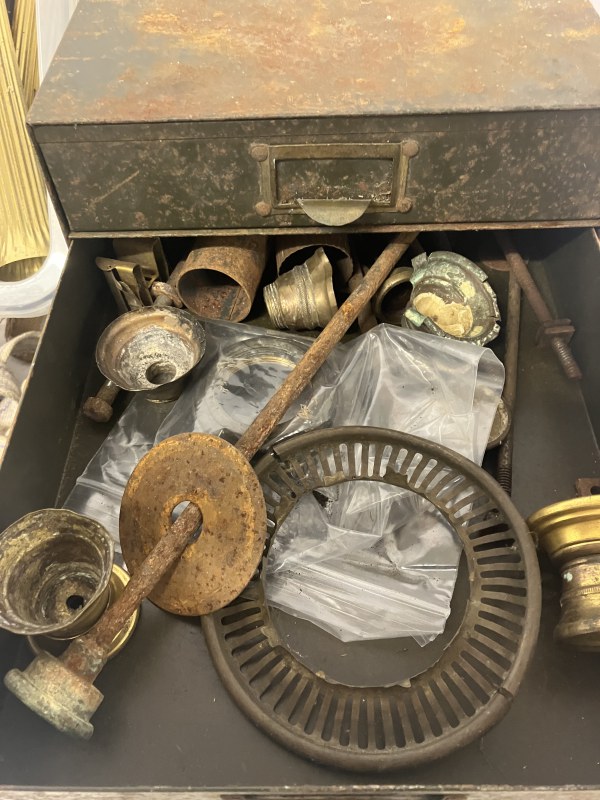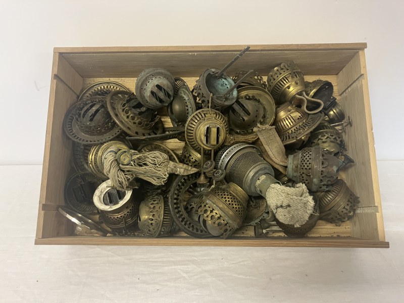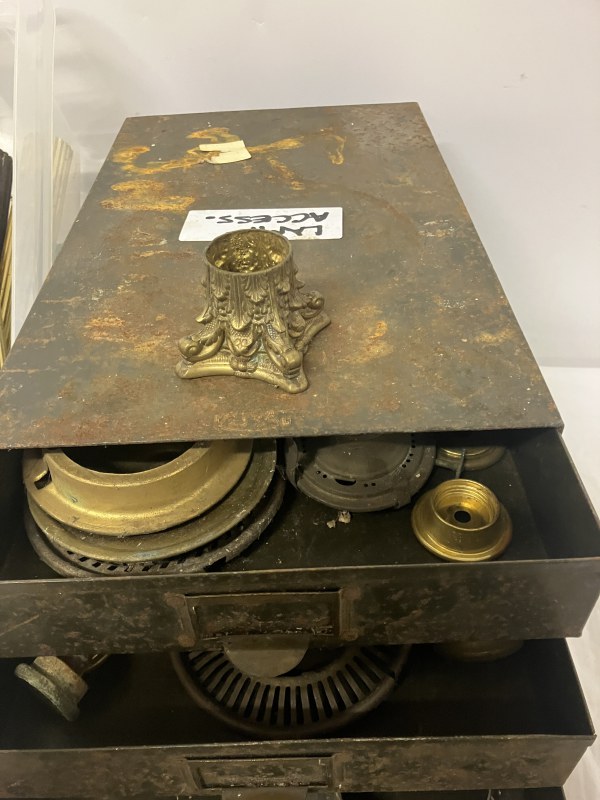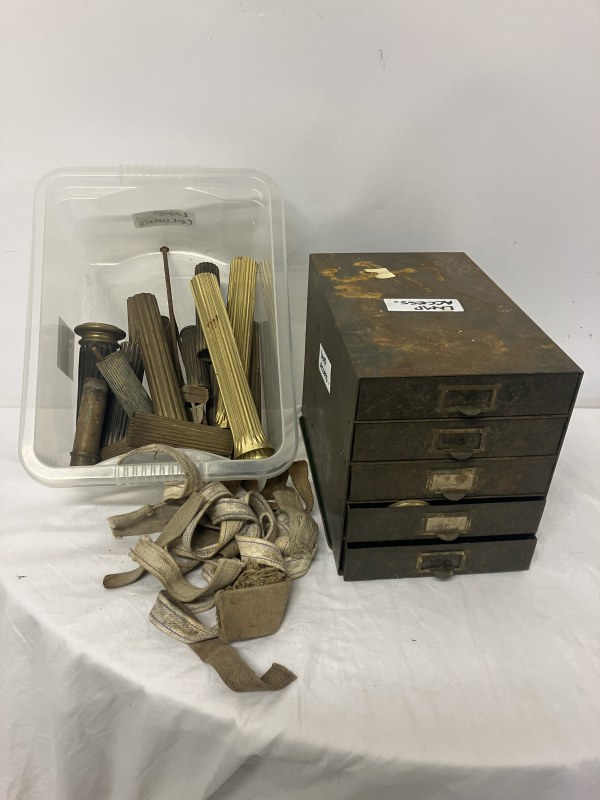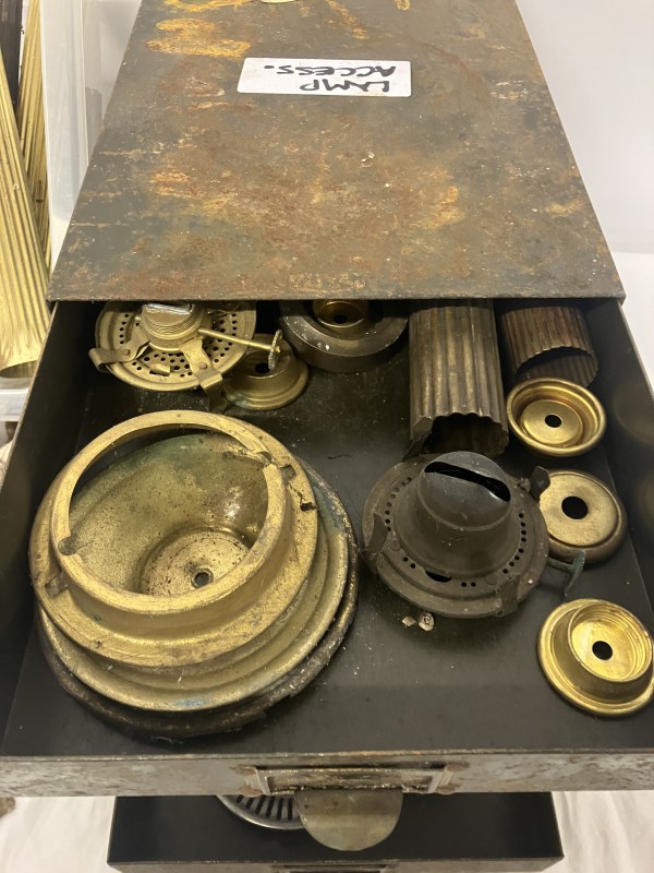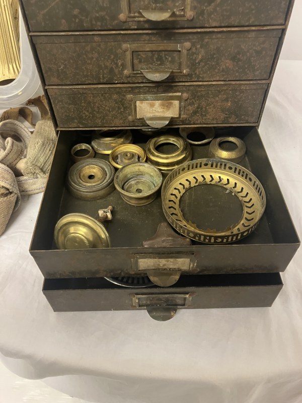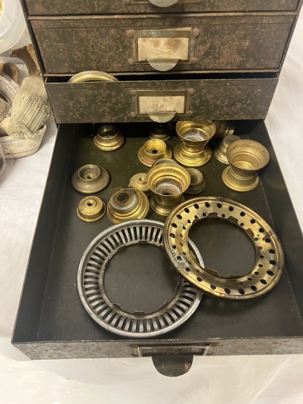 A 5 drawer metal filing box with oil lamp parts together with a box of brass column liners and wicks.
