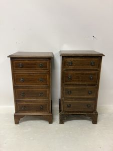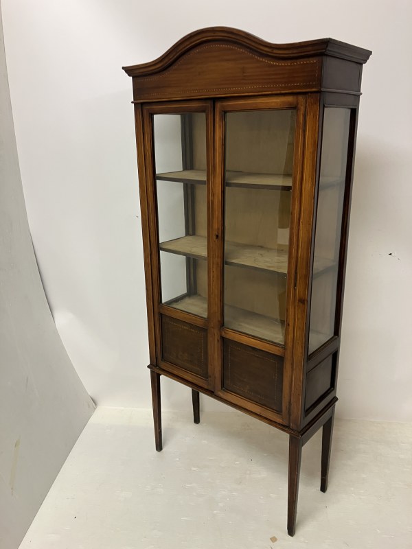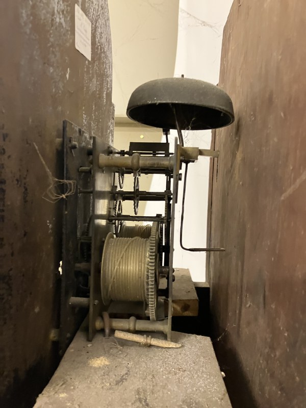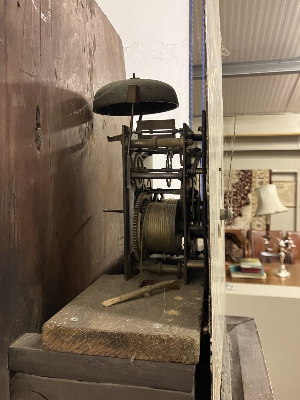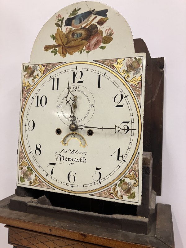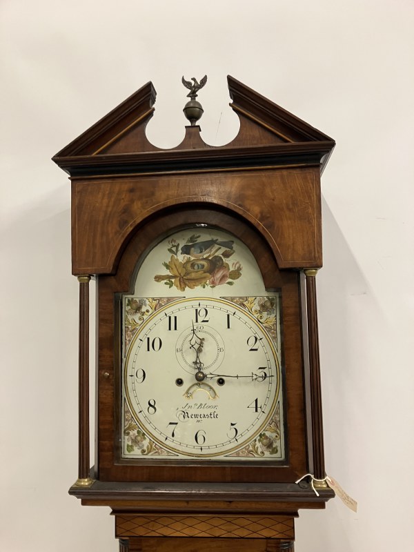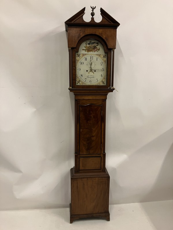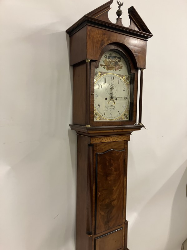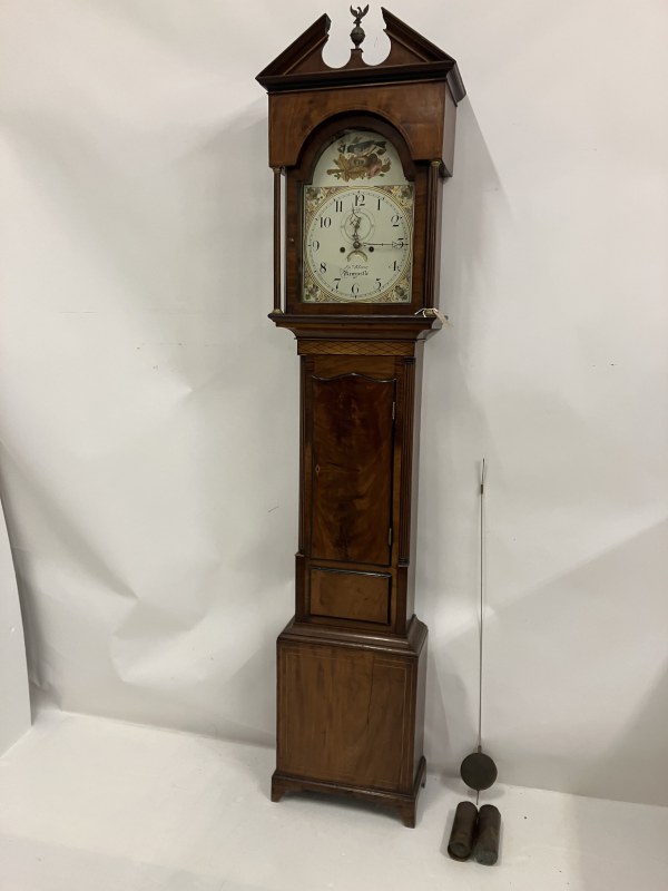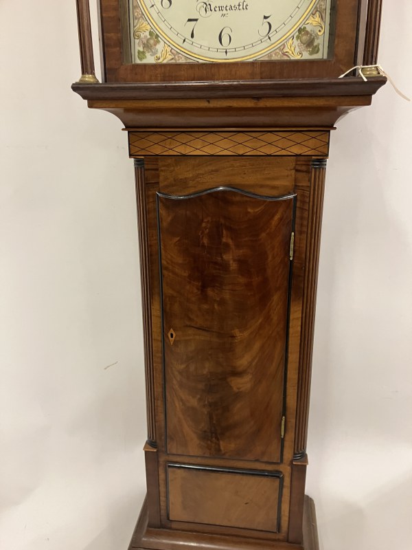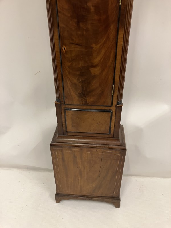 Antique long cased clock, the arch painted dial housed in a inlaid mahogany Cork case.