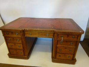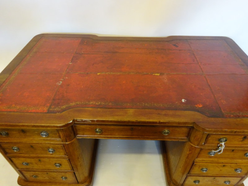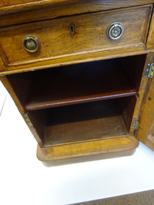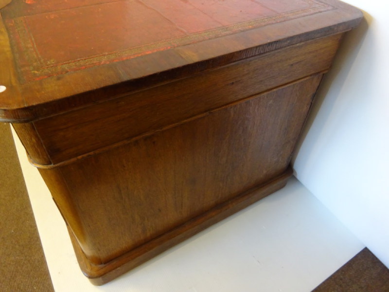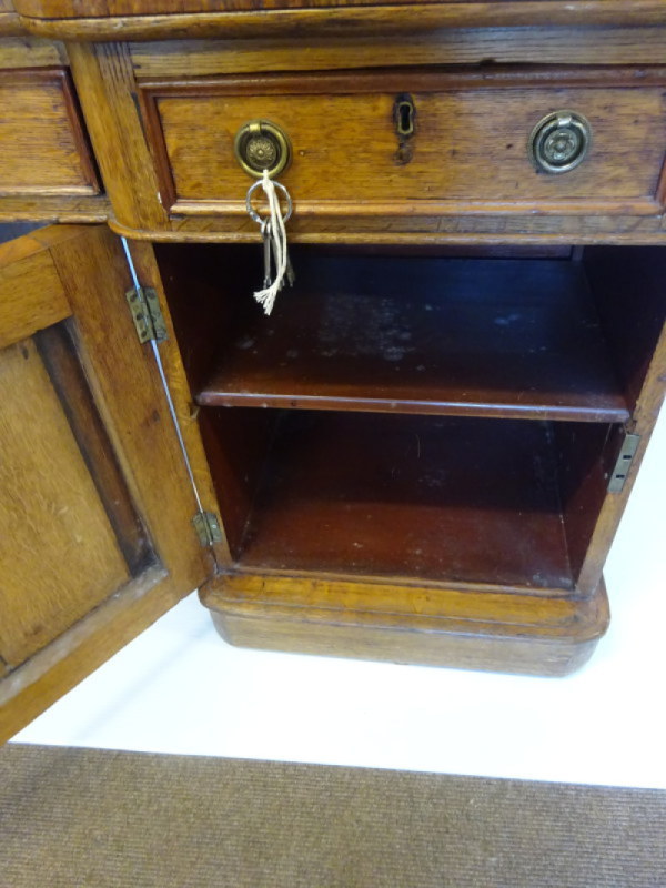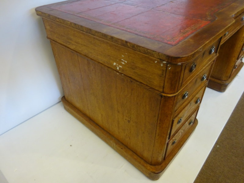 Victorian oak partners desk fitted with drawers and cupboards and raised on plinth base. 152cm x 92cm approx.