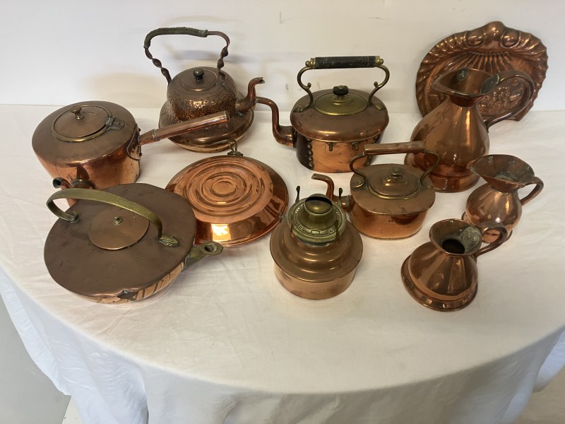 A collection of antique copper ware - measures, teapots, hot water bottle, etc.