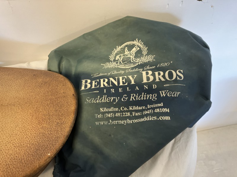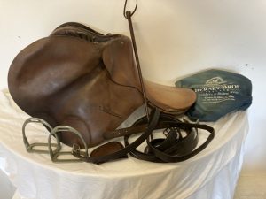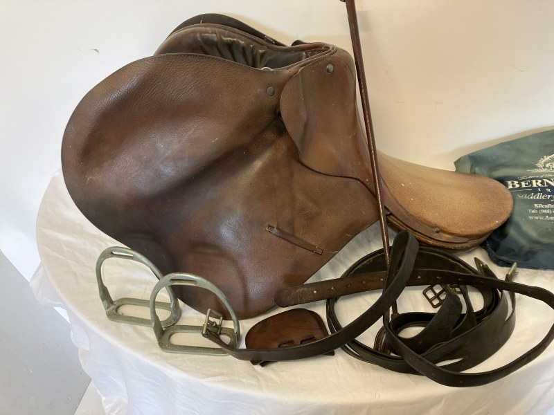 Berney Bros, Ireland - Leather saddle complete with stirrup and whip.