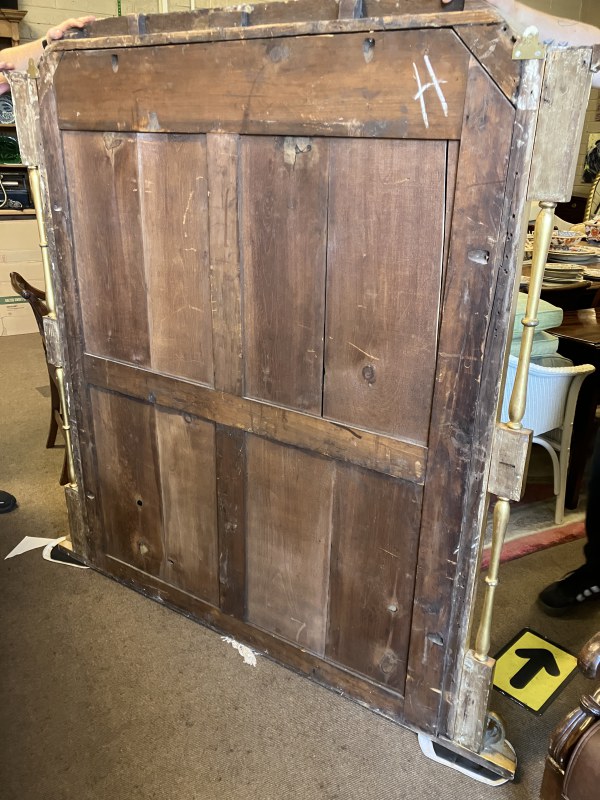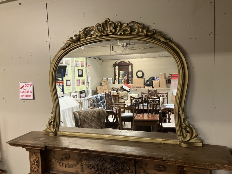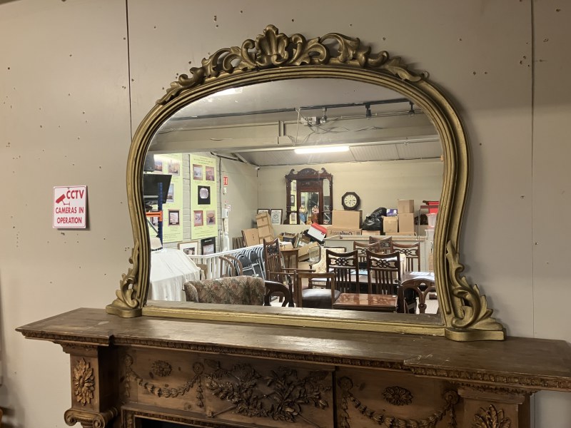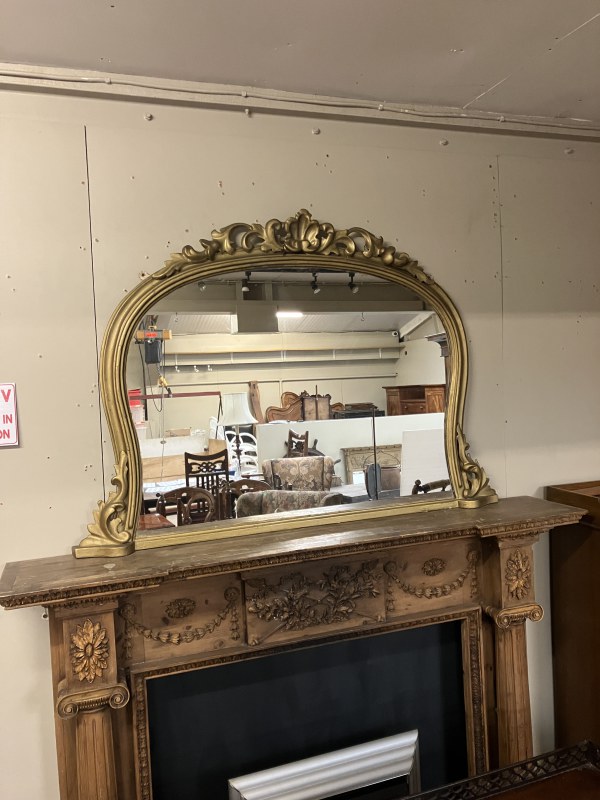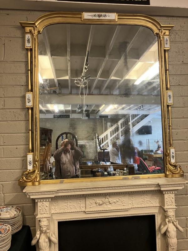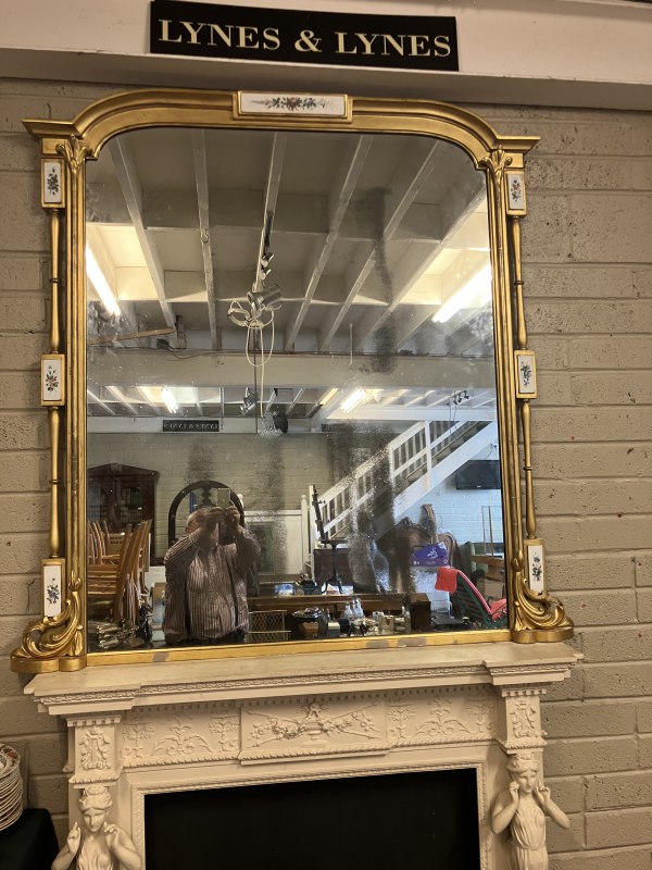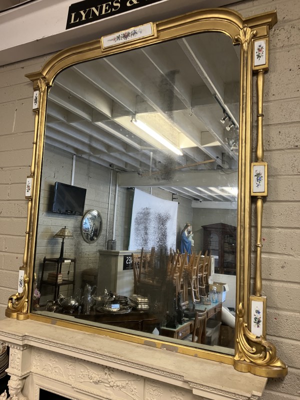 Large antique gilt framed oval mantle mirror inset with 8 porcelain floral plaques and retaining its original glass. W. 163cm, H. 165cm.