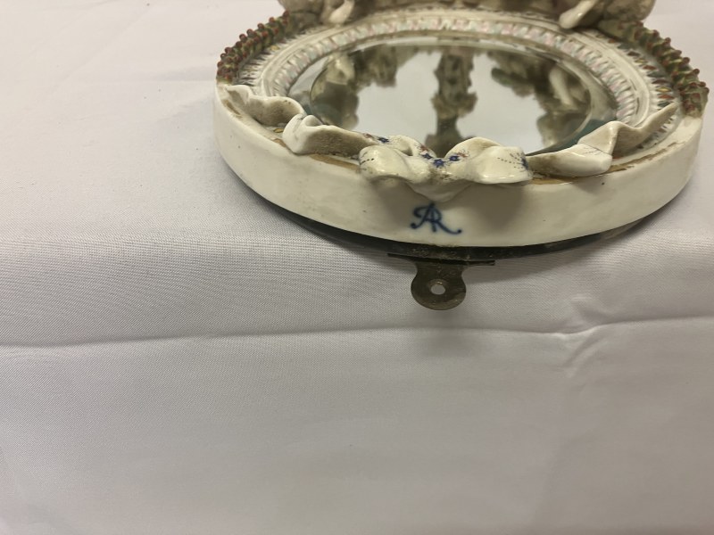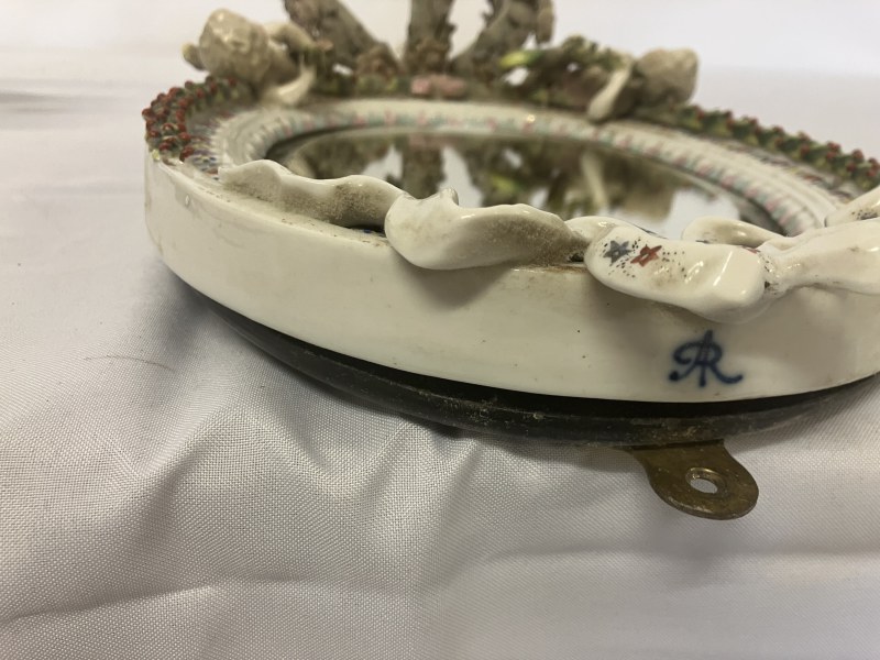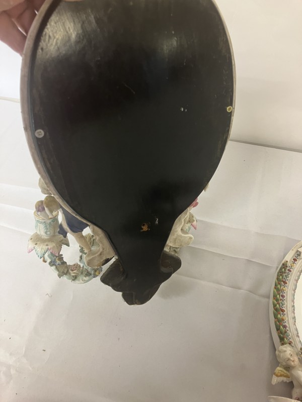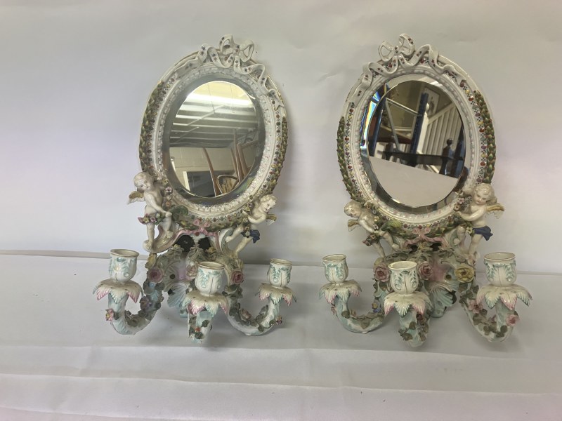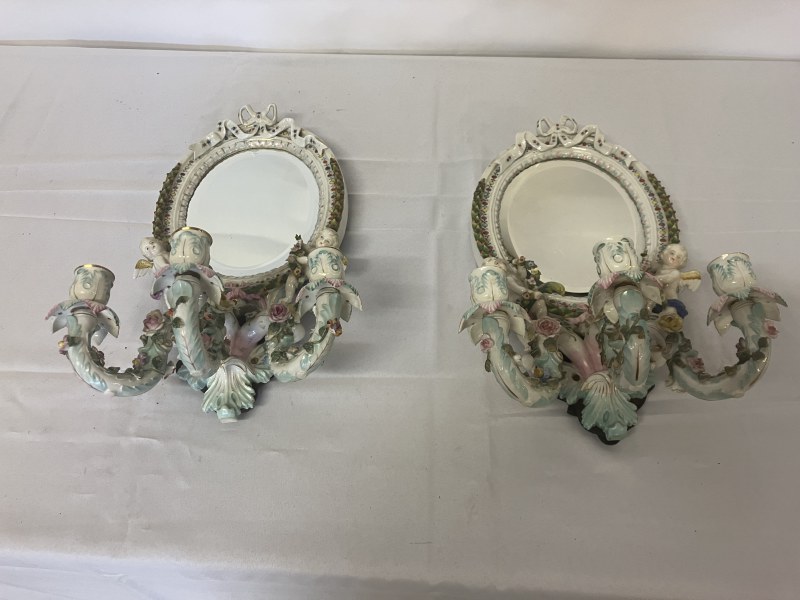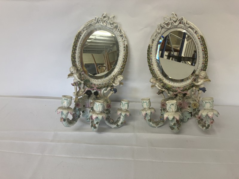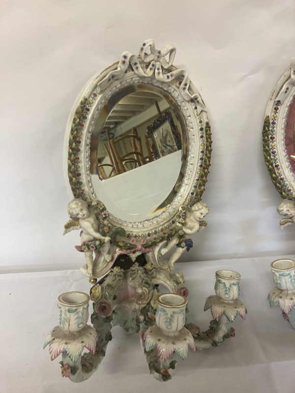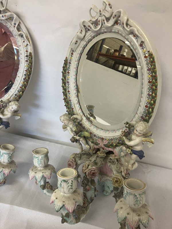 A pair of Meissen (Augustus Rex) porcelain girandole mirrors having cherubs and ribbon decoration. L. 42cm.