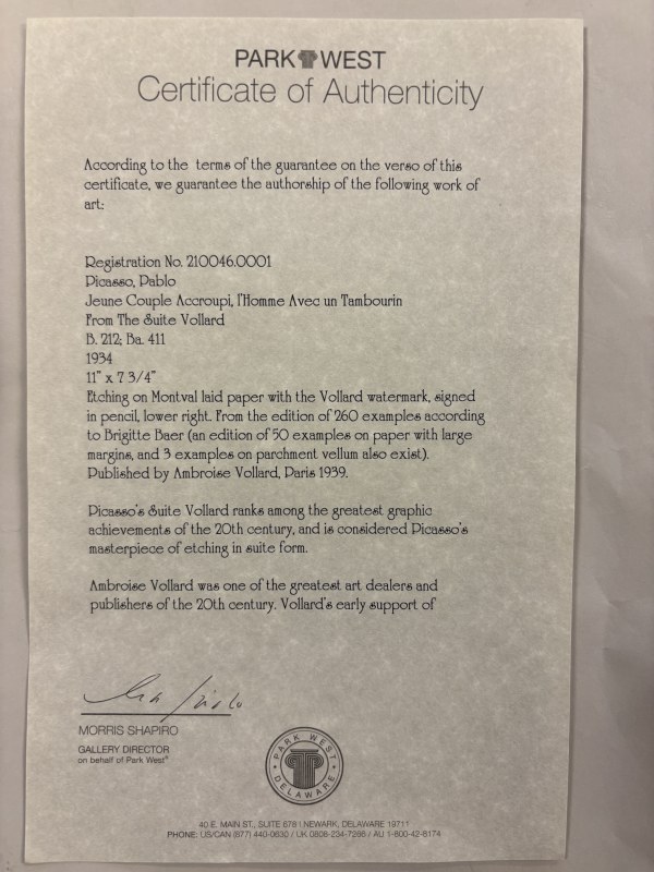 Jeune couple accroupi, l'homme avec un tambourin, from: La Suite Vollard. Etching on Montval laid paper, watermark Montgolfier, signed in pencil from the edition of 260, published by A. Vollard, Paris, 1939. 27cm x 19cm.