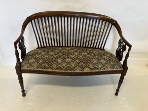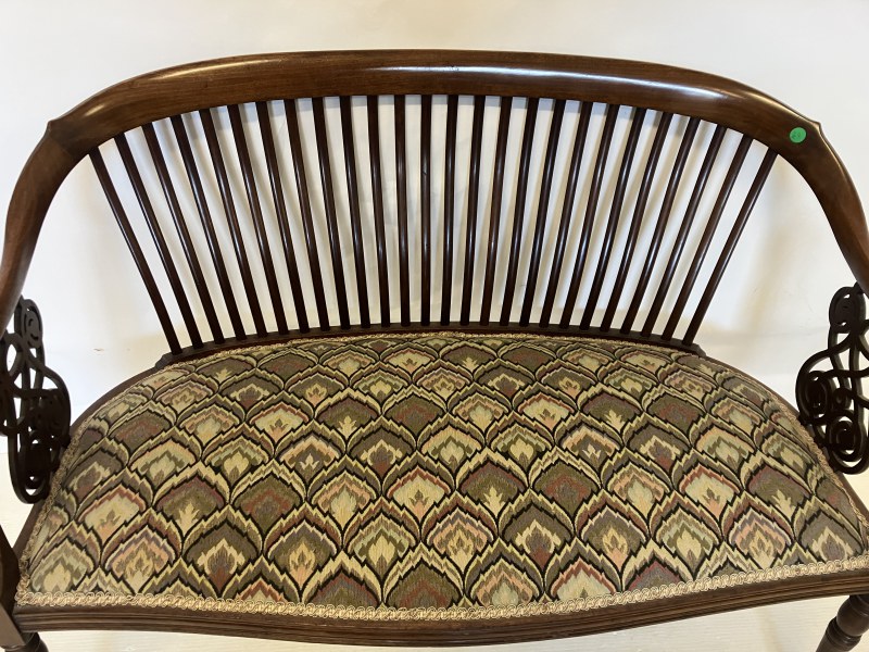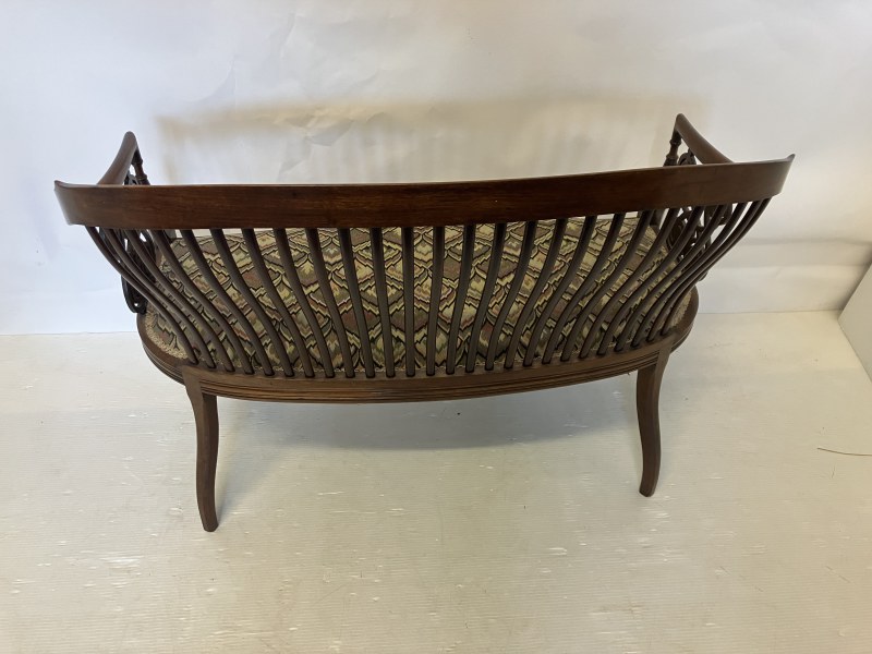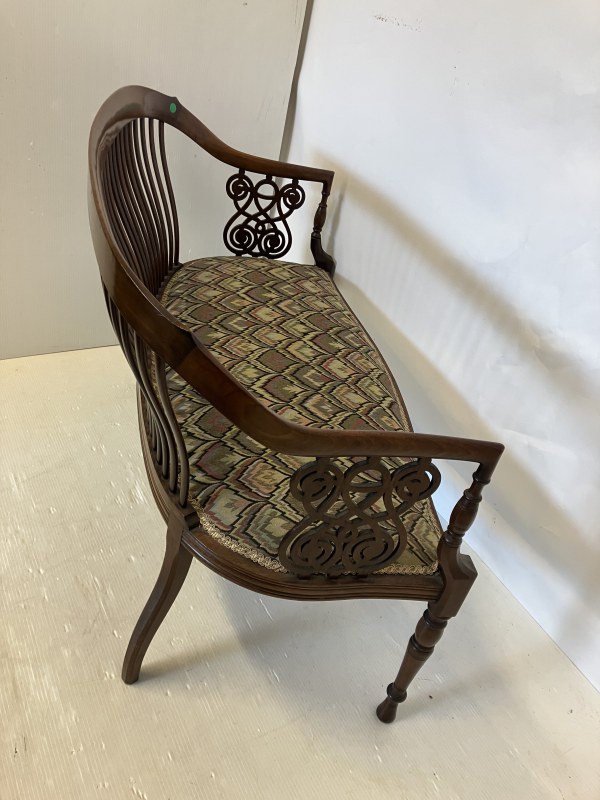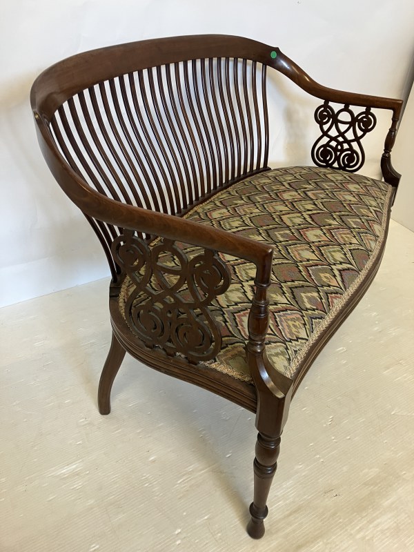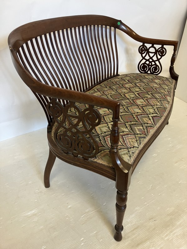 A very fine Edwardian mahogany settee having curved and latted back, carved side panels and raised on turned legs. W. 102cm, H. 76cm.