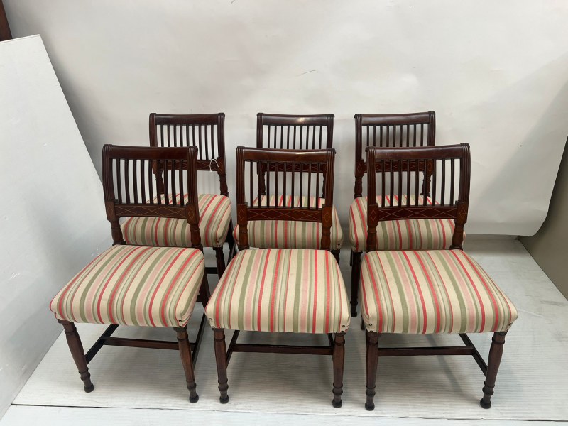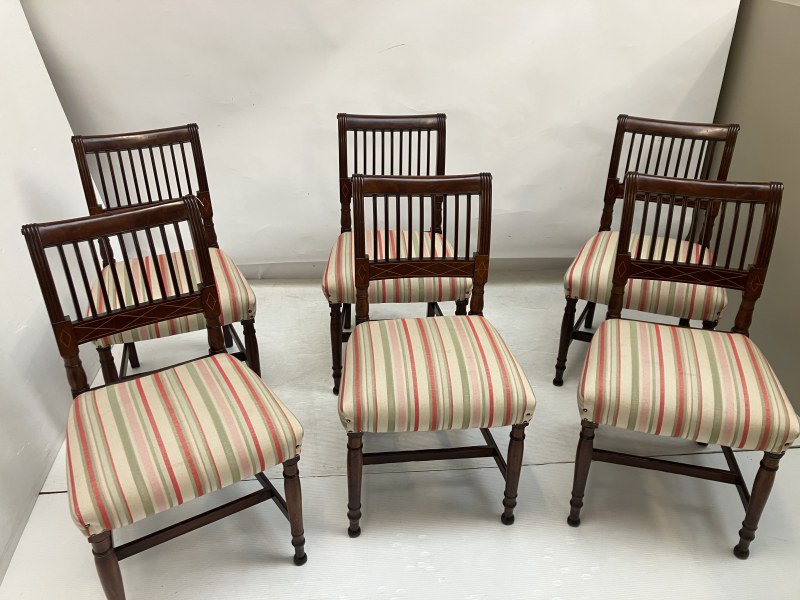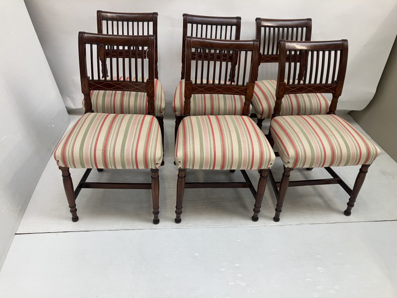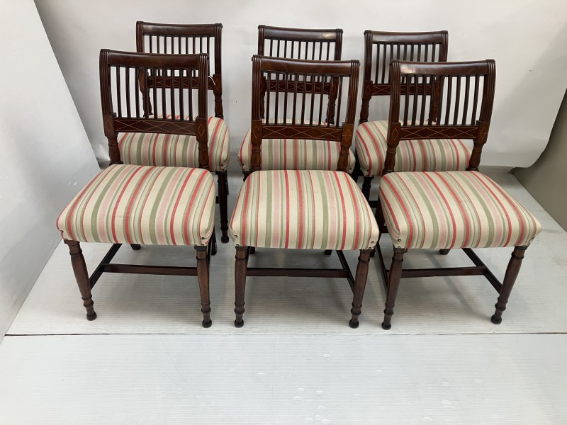 A set of 6 Georgian mahogany Cork 9 bar chairs raised on turned legs with cross stretchers.