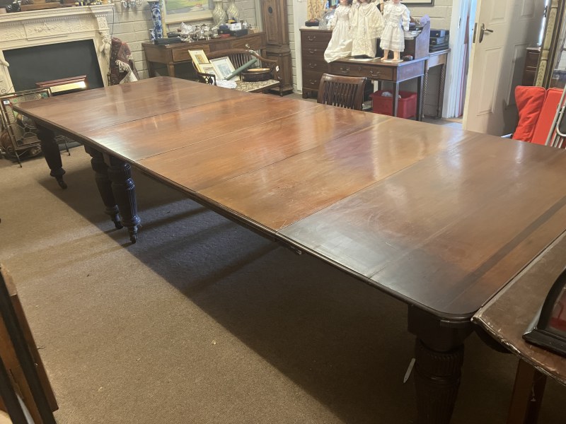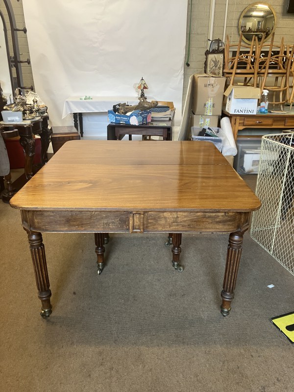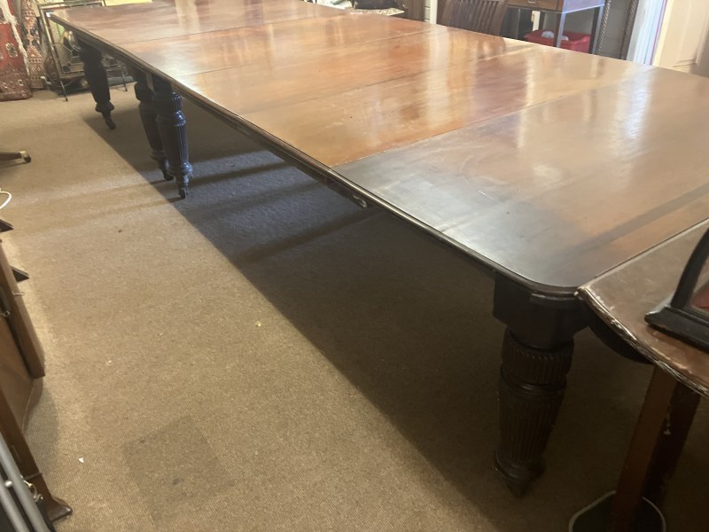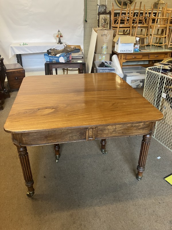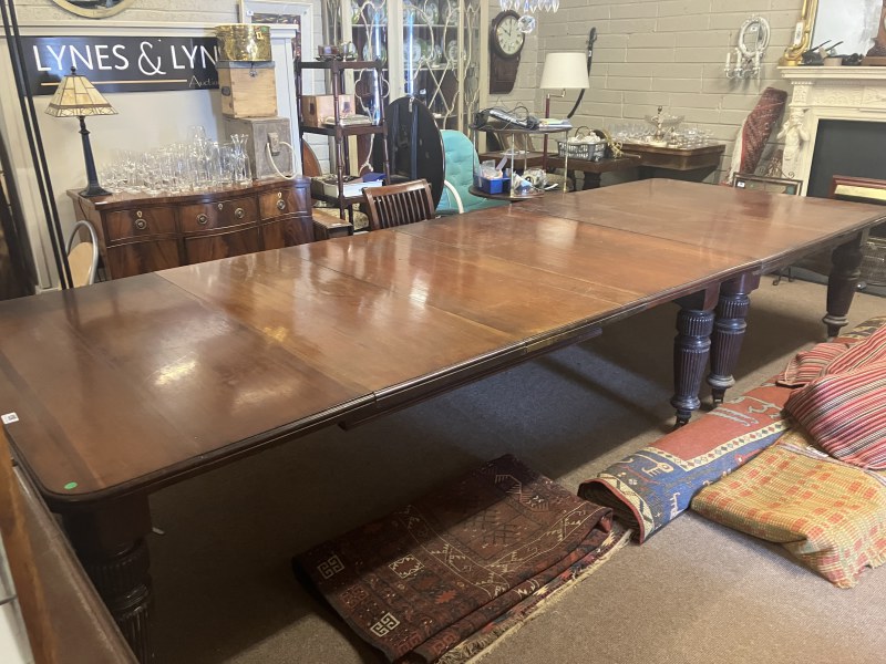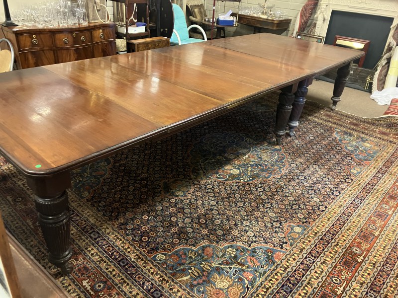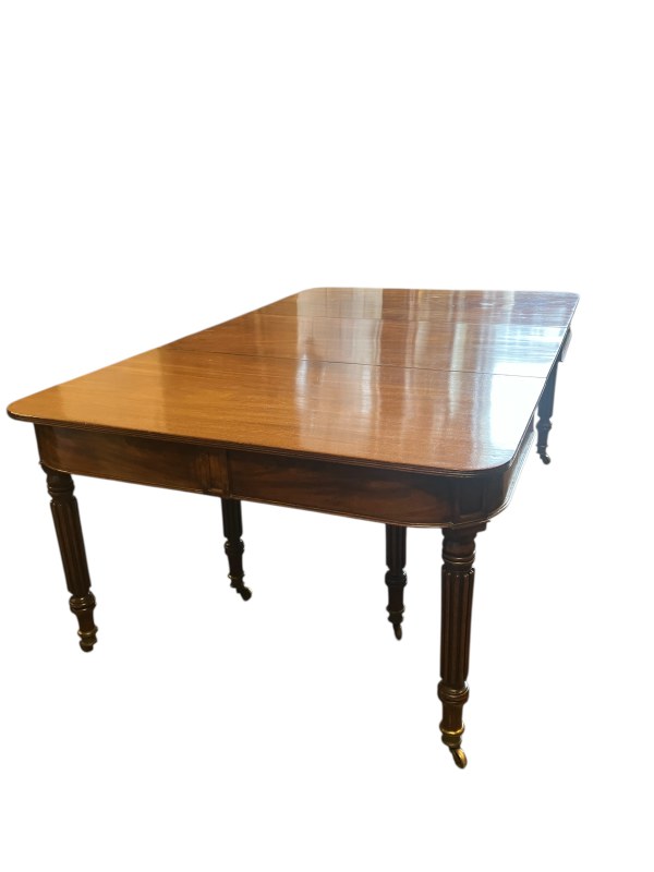 A fine Regency mahogany dining table, the D shaped top having 1 original leaf and (2 others),raised on 8 fluted legs with brass wheel castors. L. with original leaf 200cm, W. 122cm. (W. of other leaves 40cm)