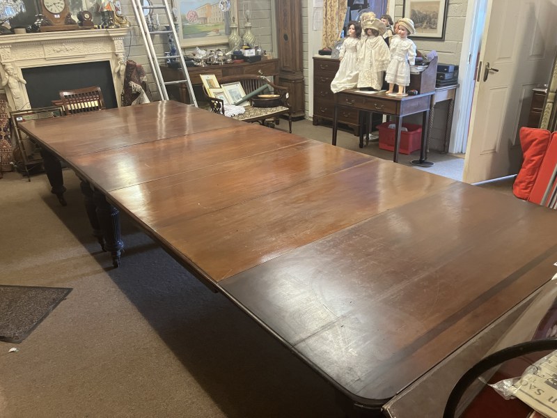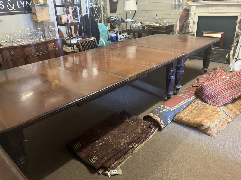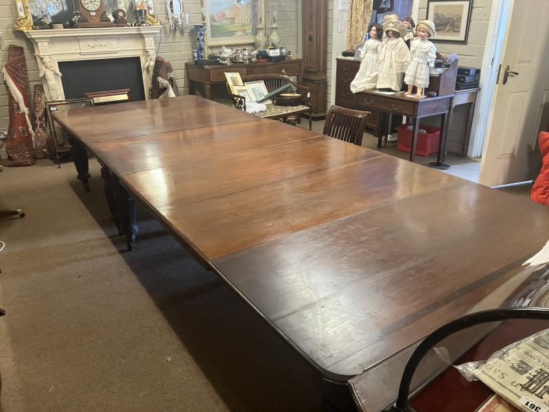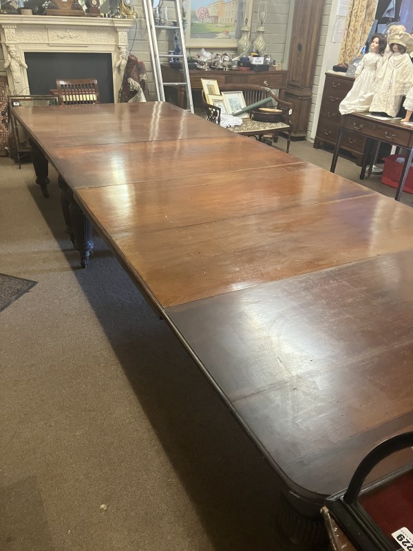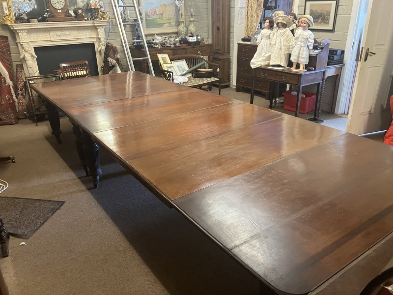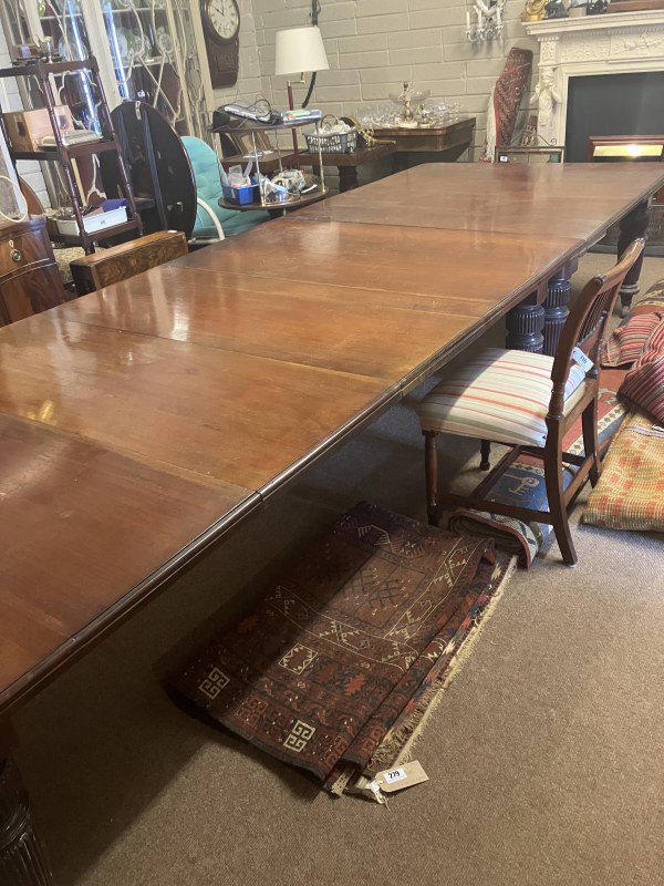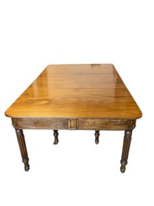 A fine Regency mahogany dining table, the D shaped top having 1 original leaf and (2 others),raised on 8 fluted legs with brass wheel castors. L. with original leaf 200cm, W. 122cm. (W. of other leaves 40cm)