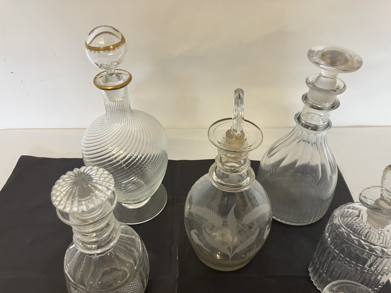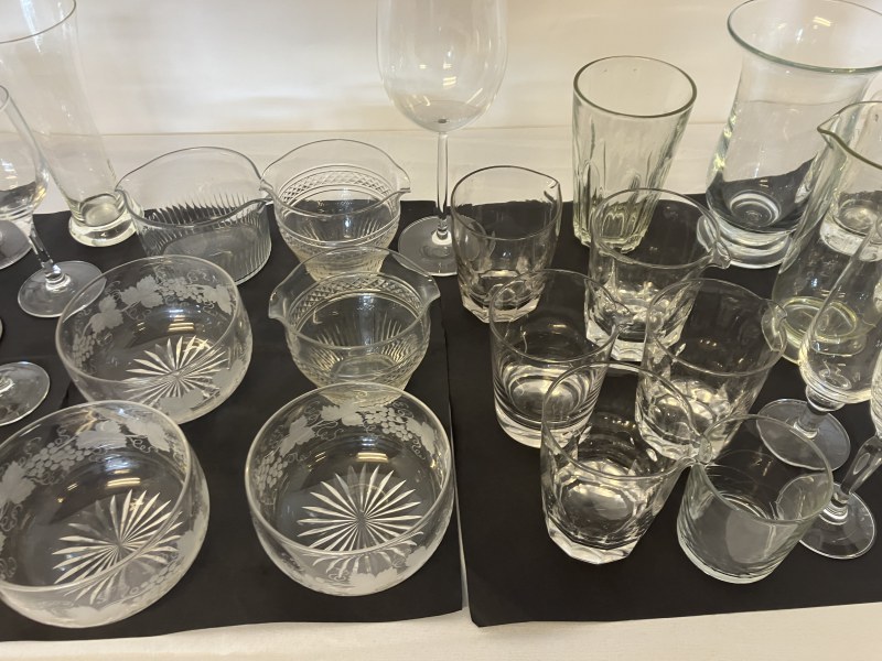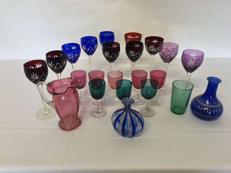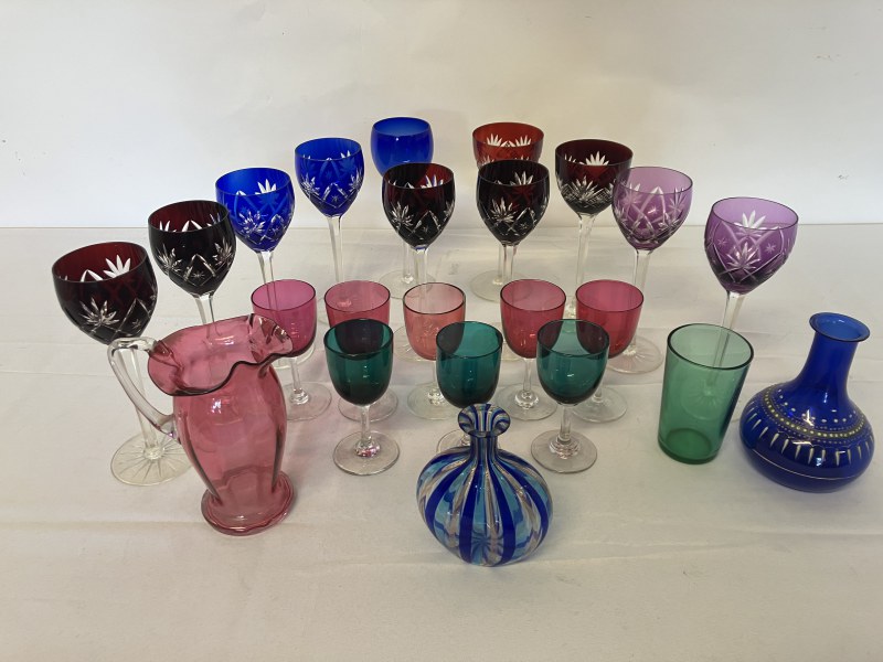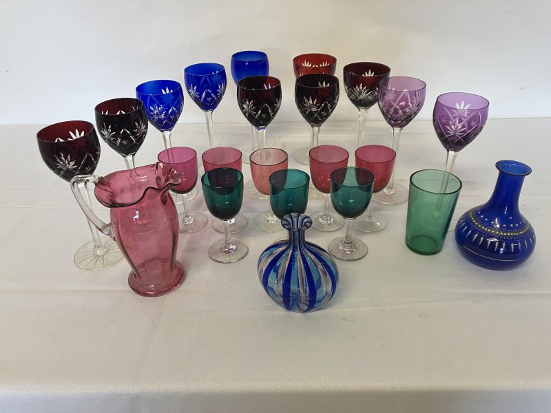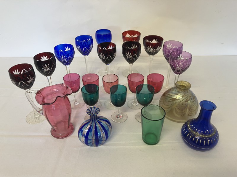A collection of coloured glass ware to include wine glasses, jugs, decanters, etc.