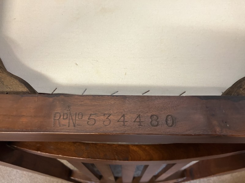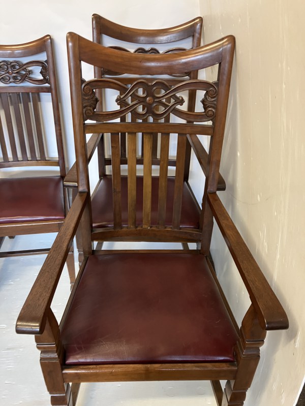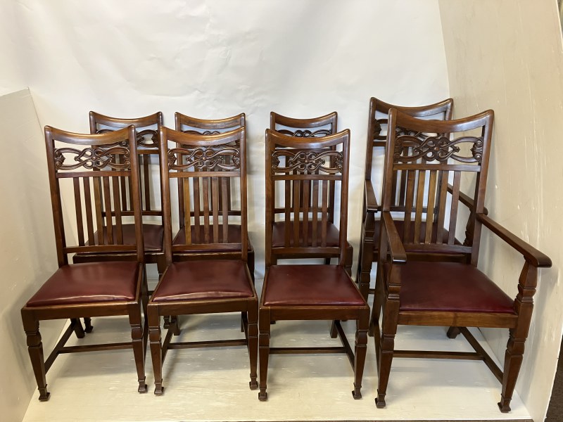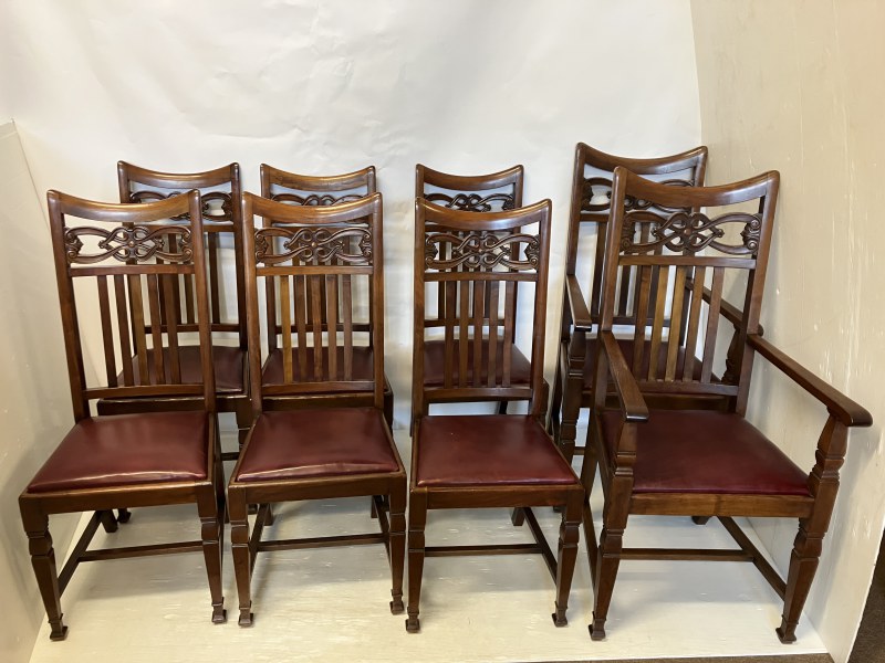 A set of 8 Arts & Crafts mahogany dining chairs having decorative backs and raised on square tapered legs, each chair stamped with registration number. (6 + 2 carvers)