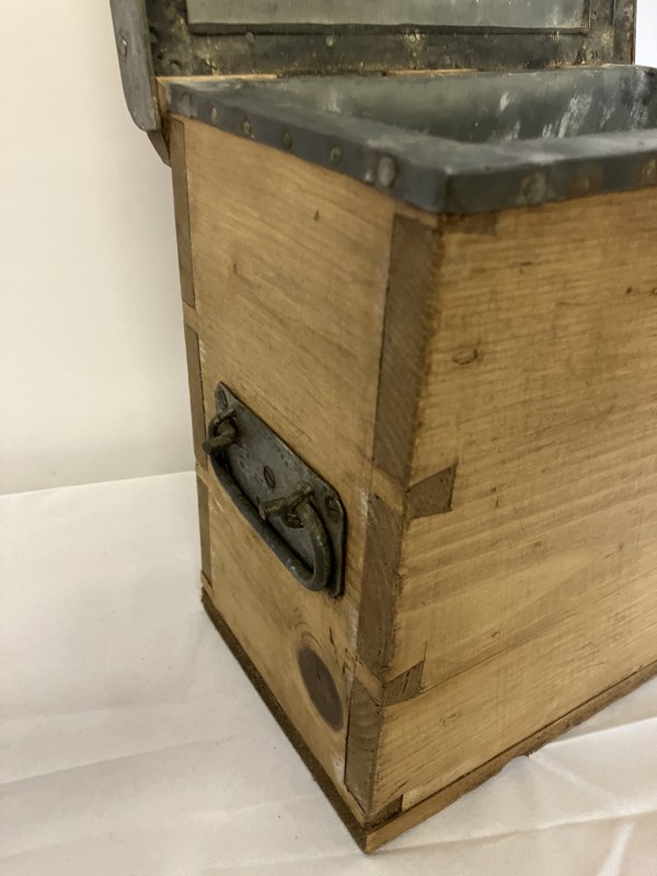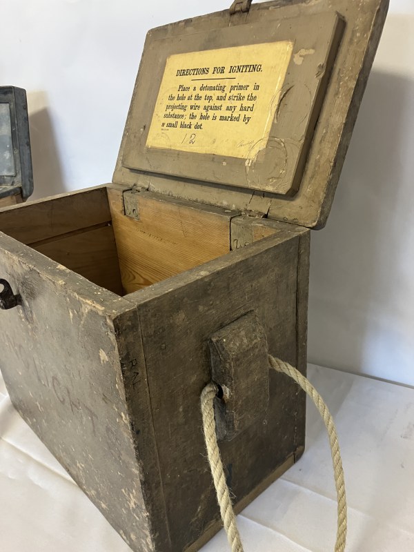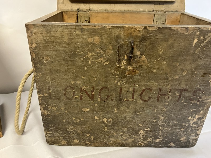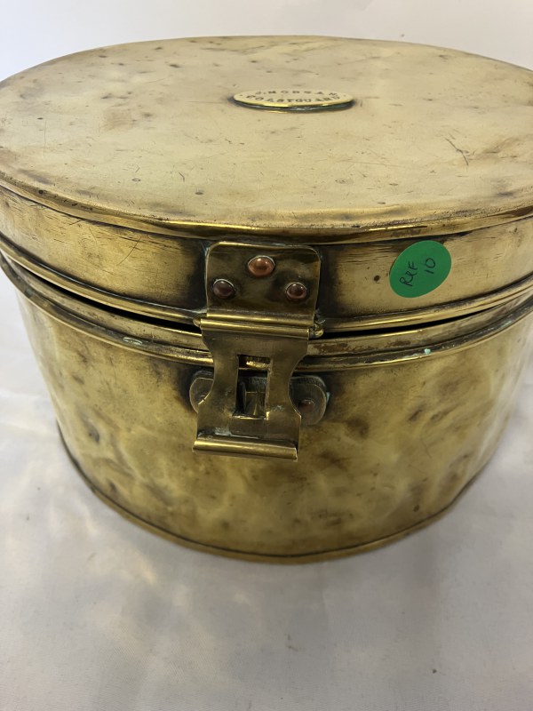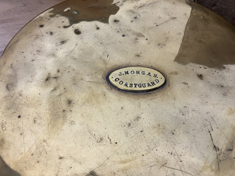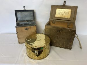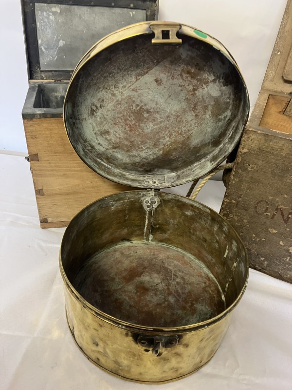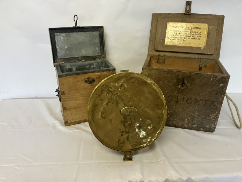 One old circular brass container and lid stamped J. Morgan, Coastguard together with 2 timber coastguard boxes. (3)