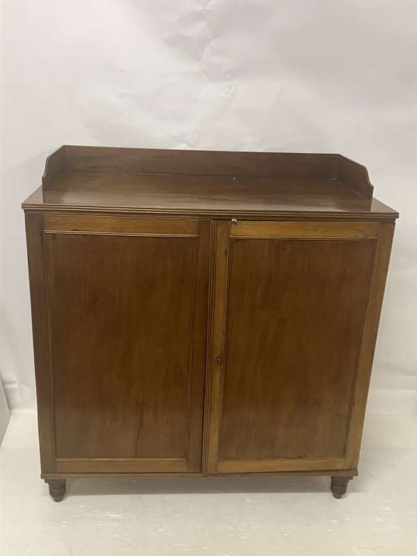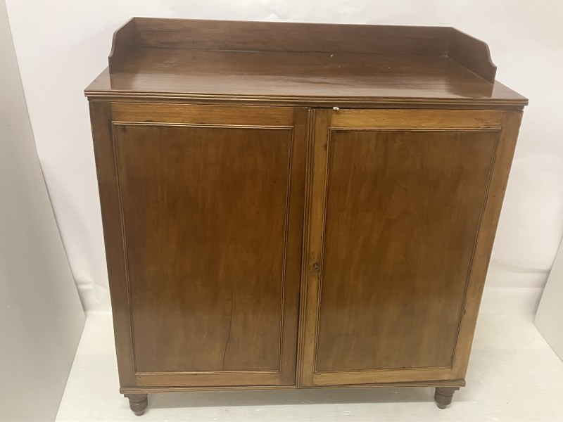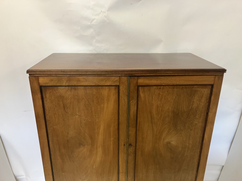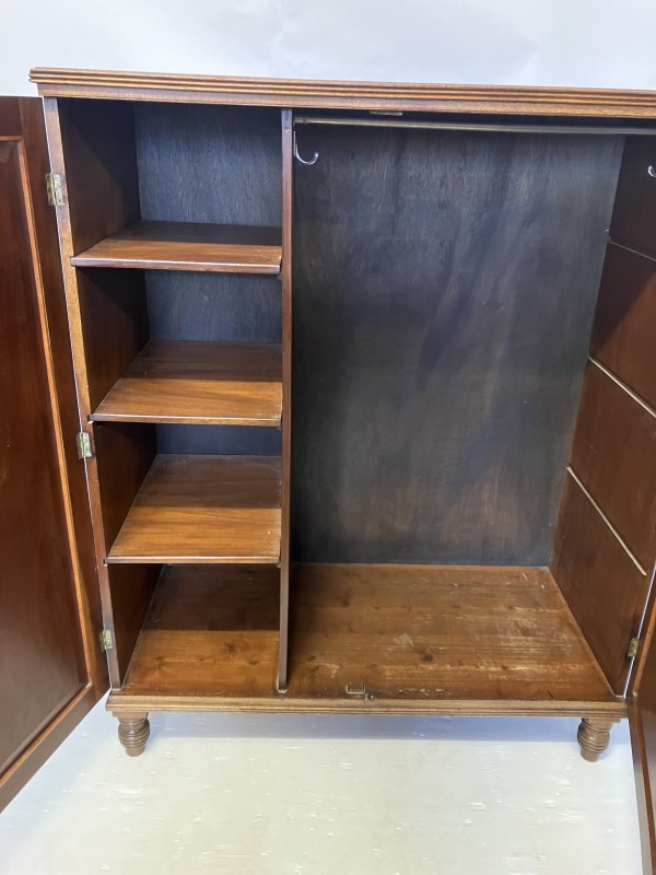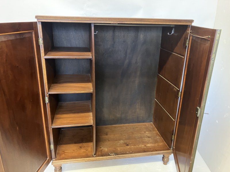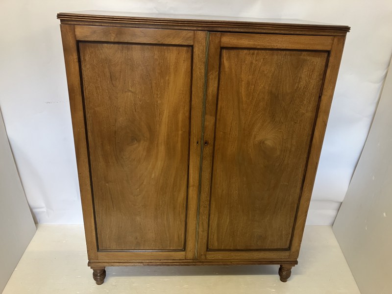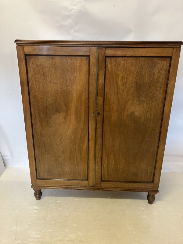 A Cork Regency mahogany 2 door wardrobe raised on reeded turned legs. W. 120cm, D. 56cm, H. 147cm approx.
