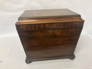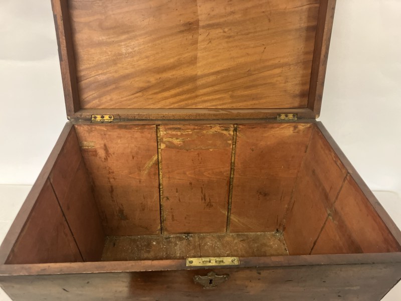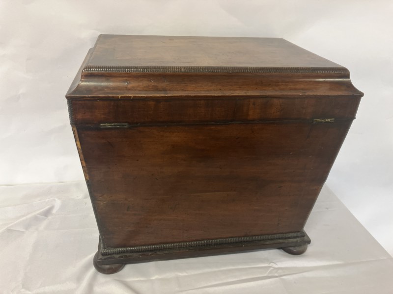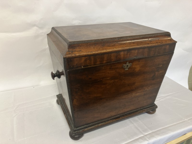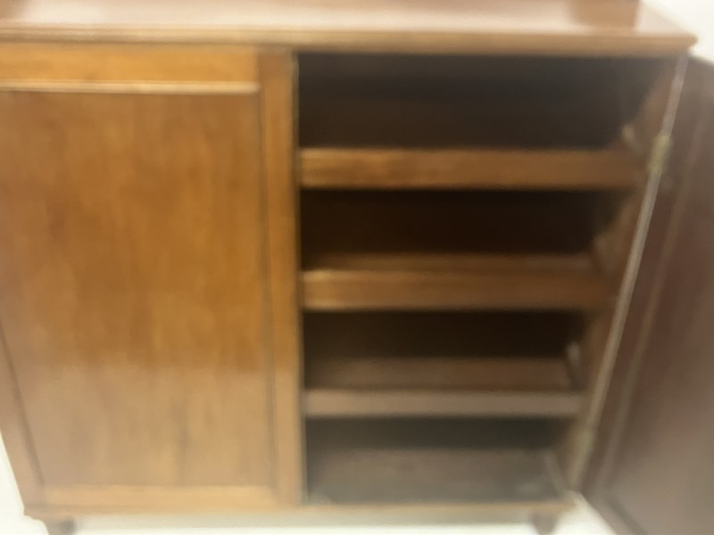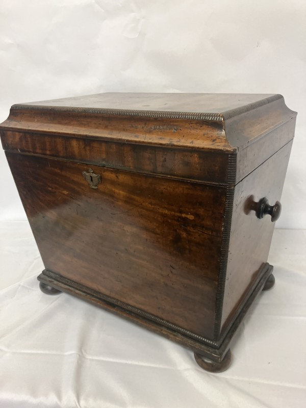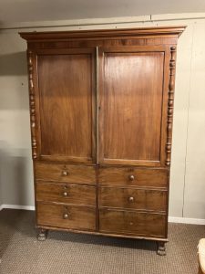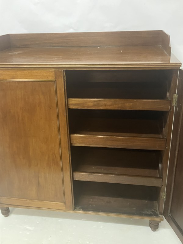 Antique Cork mahogany tray top linen press having 2 paneled doors, the inside fitted with 3 sliding shelves, raised on turned feet. W. 113cm, D. 57cm, H. 122cm approx.