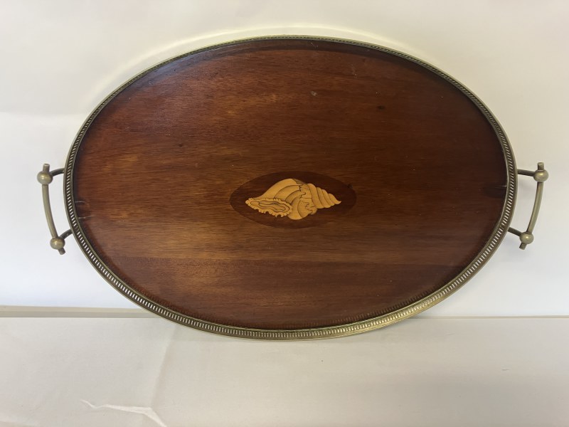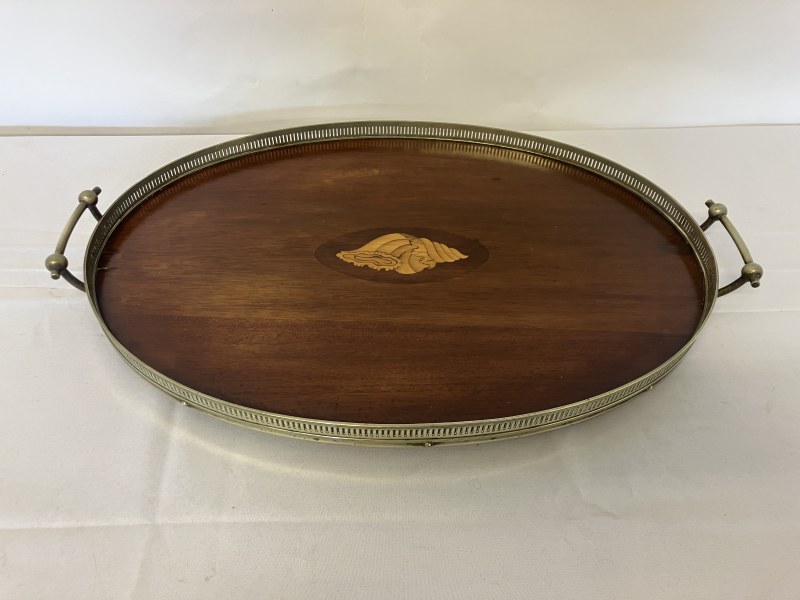 Victorian inlaid mahogany serving tray with plated gallery and handles.