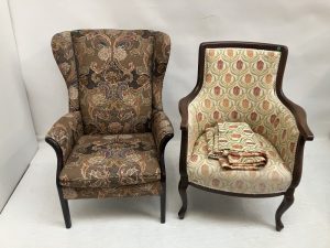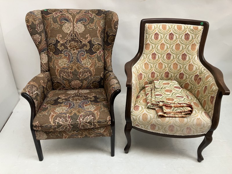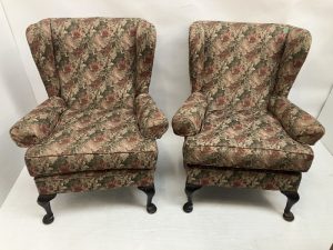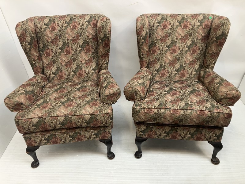 A pair of wing back drawing room chairs raised on Queen Anne style legs.