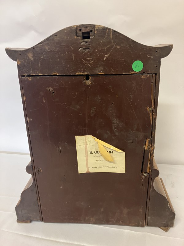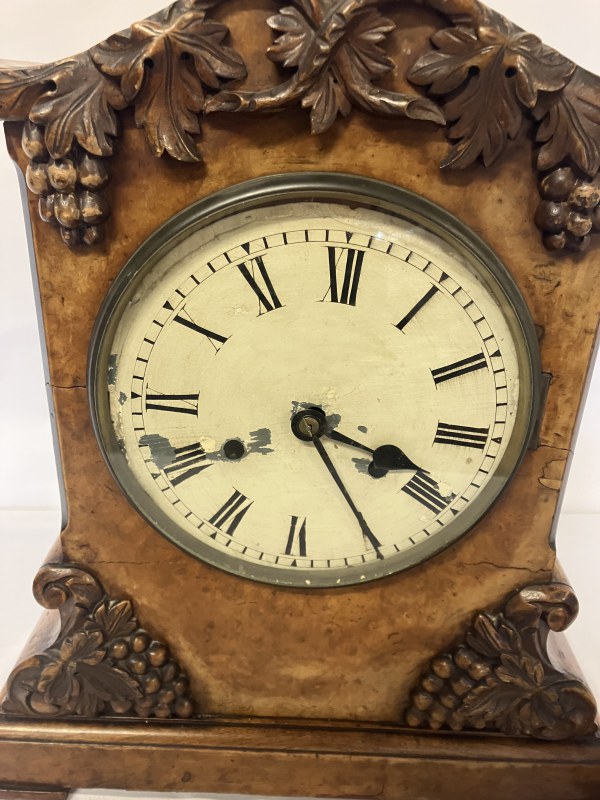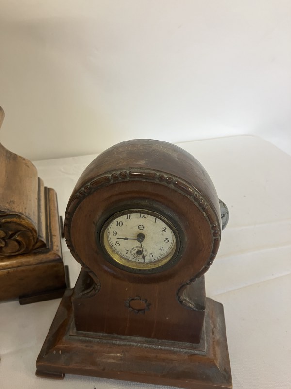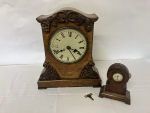 Large 19th century walnut table clock with carved fruit decoration and a small timber mantle clock. AF