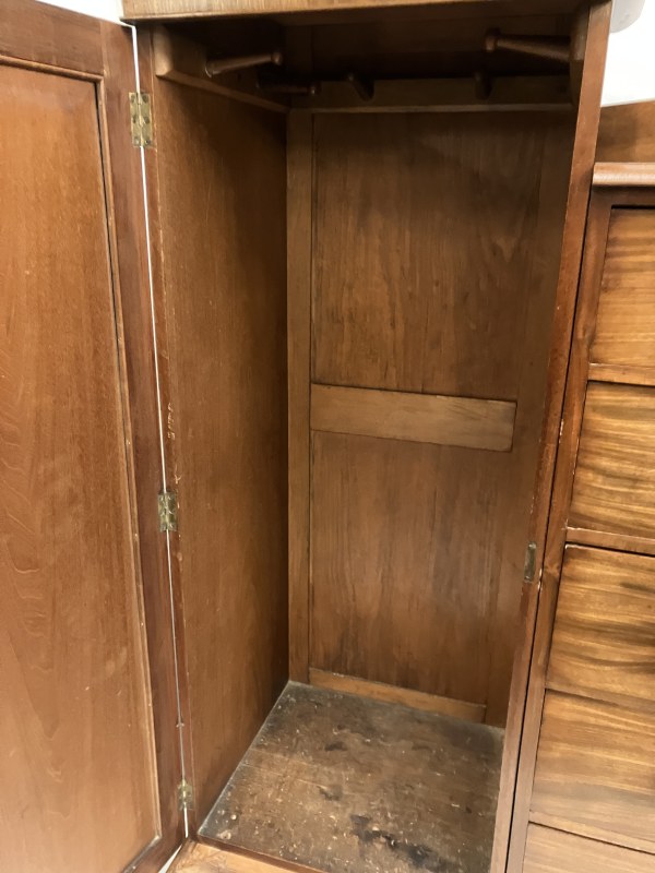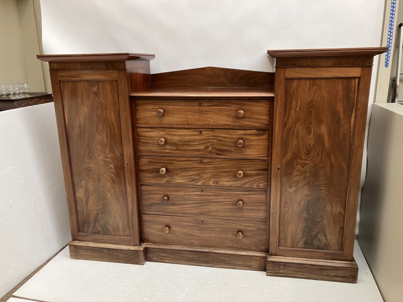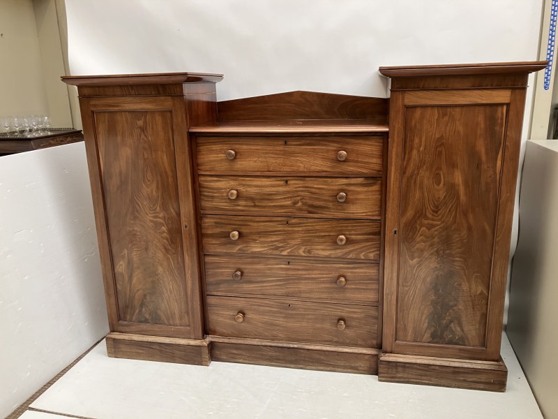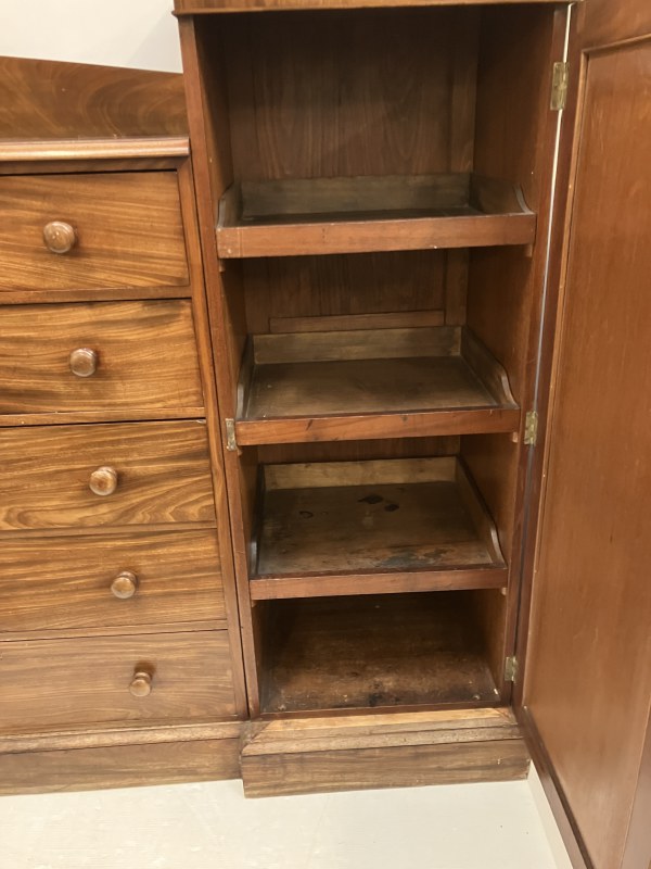 A good antique mahogany wardrobe, the centre section fitted with 5 long drawers with hanging and shelving cupboards on either side. H. 160cm, W. 220cm, D. 57cm approx.