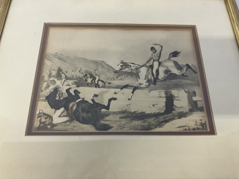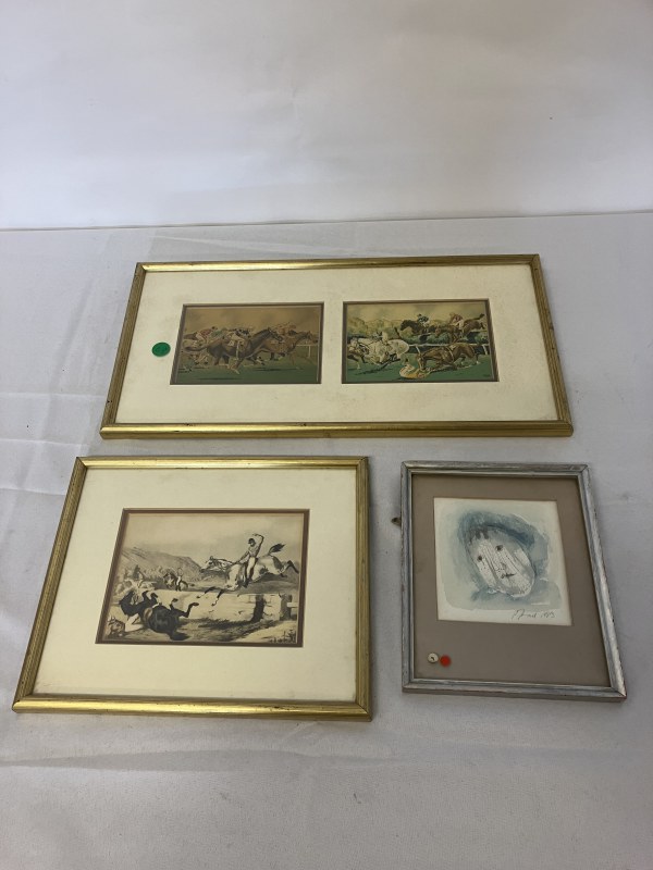 Mixed lot - a pair of horse racing scenes in 1 frame, a hunting scene and a small signed Watercolour.