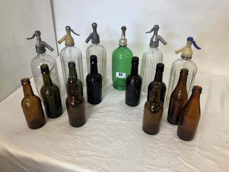 A collection of old pub bottles - 4 O'Reilly & Son, Queenstown; 2 John Daly, Cork; 2 PJ Scanlan Merchant St & Smith St, Cork and 2 others together with 6 old soda syphons. AF