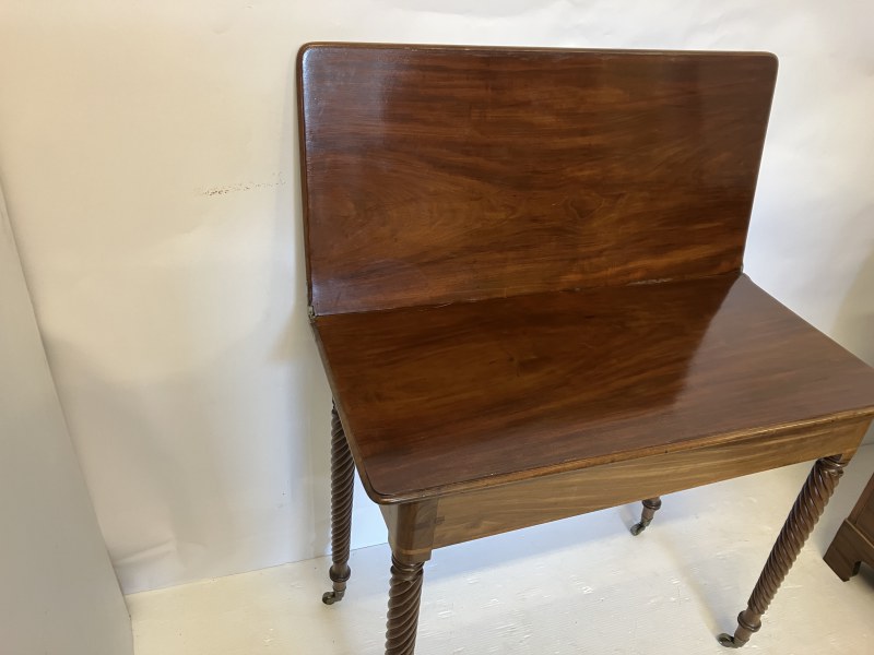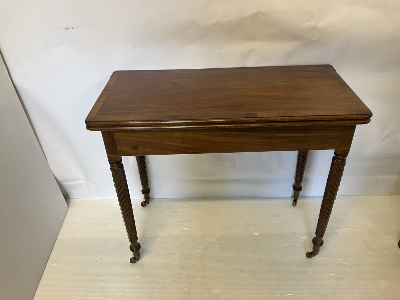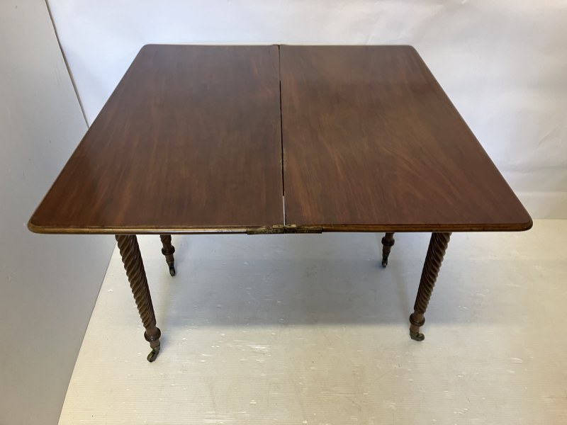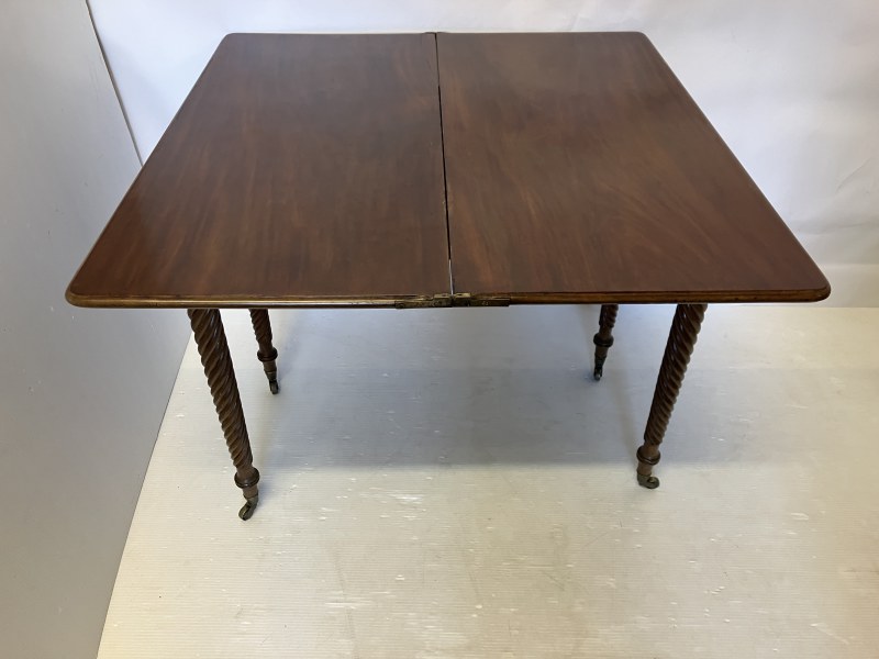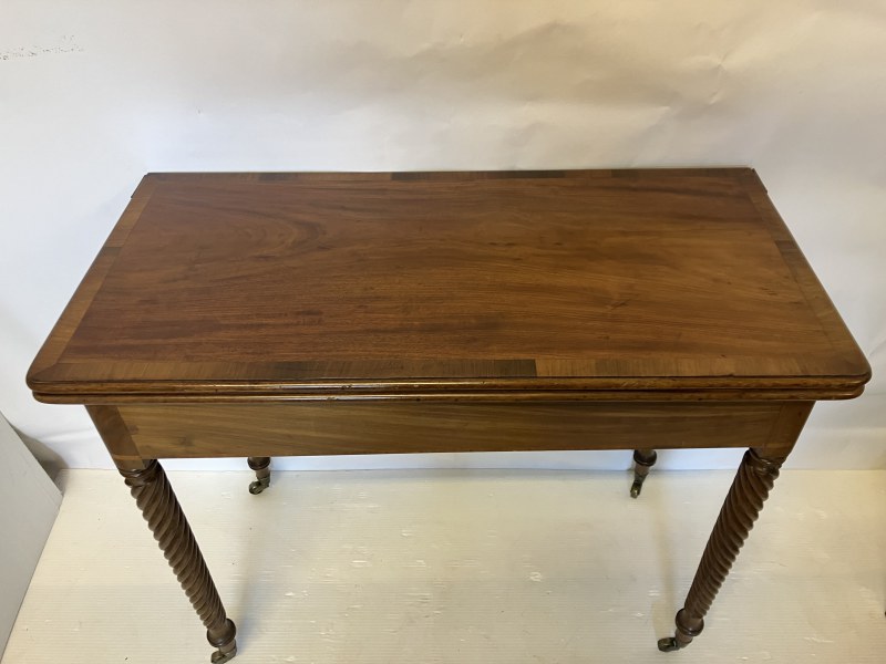 A Regency (Cork) mahogany tea table. the folding rectangular top having rosewood cross banding and raised on spiral turned legs. W. 90cm, D. 43cm. H. 76cm.