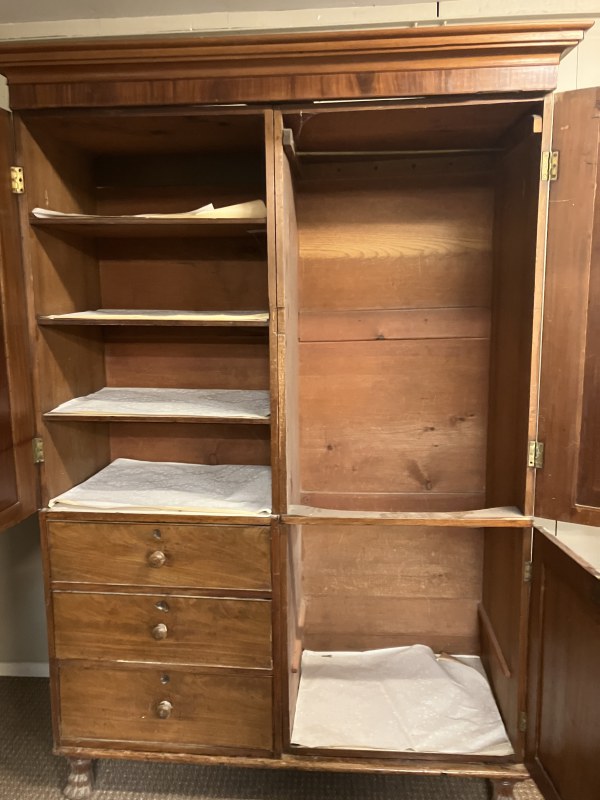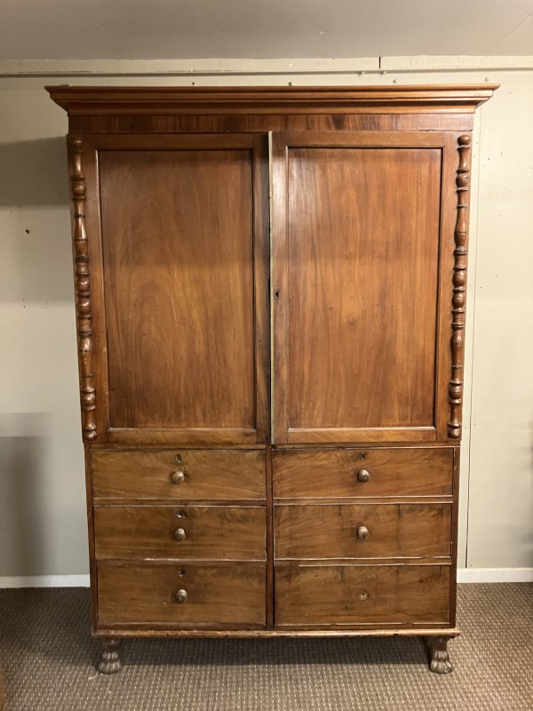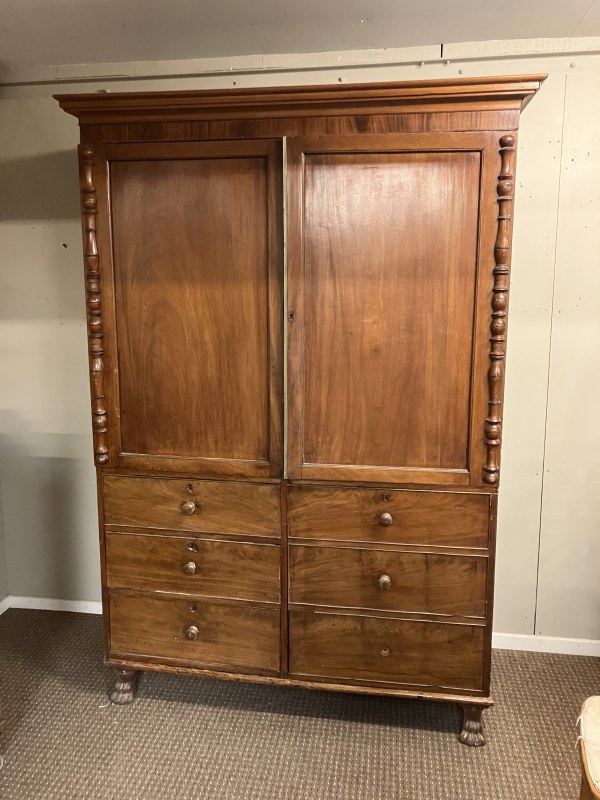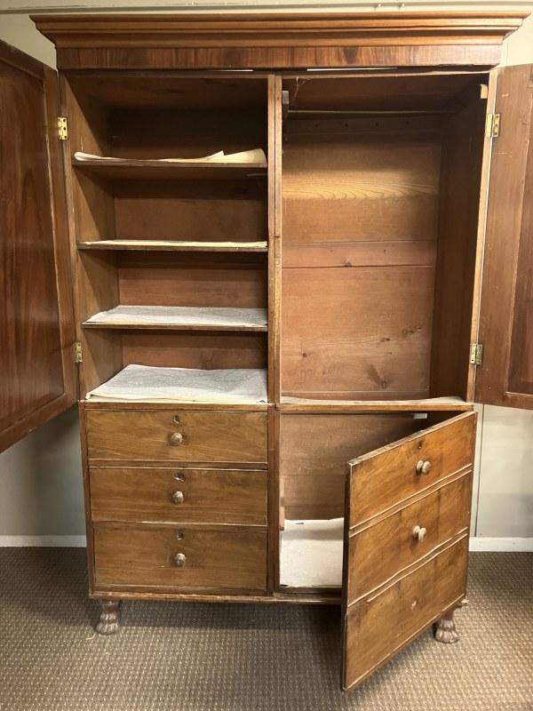 Early 19th century mahogany 2 door wardrobe, one side having shelved interior over 3 drawers, the other side having full hanging with dummy drawer door raised on lion claw feet. H. 215cm, W. 140cm, D. 57cm approx.