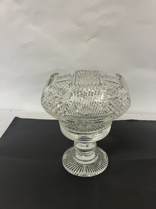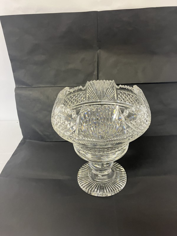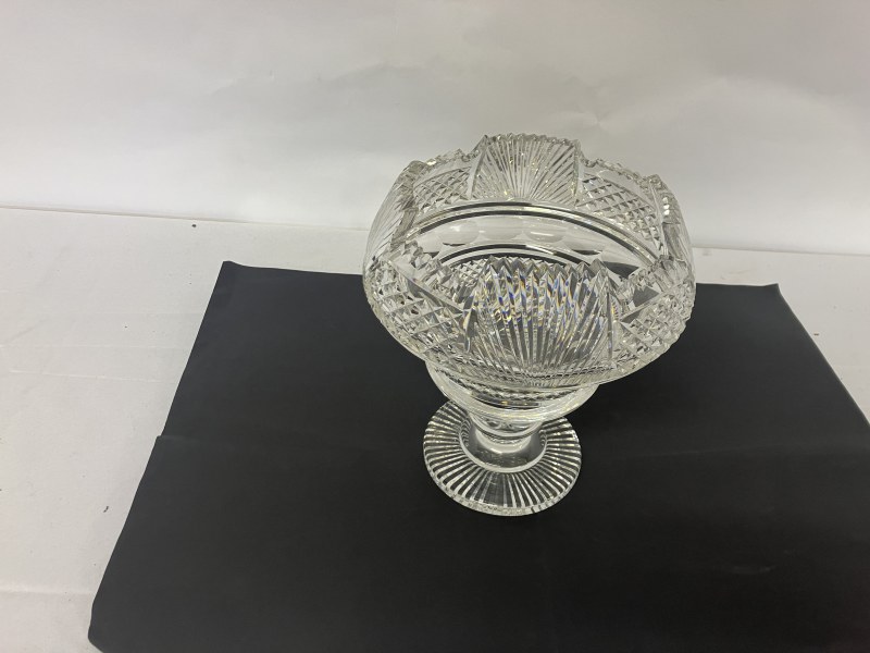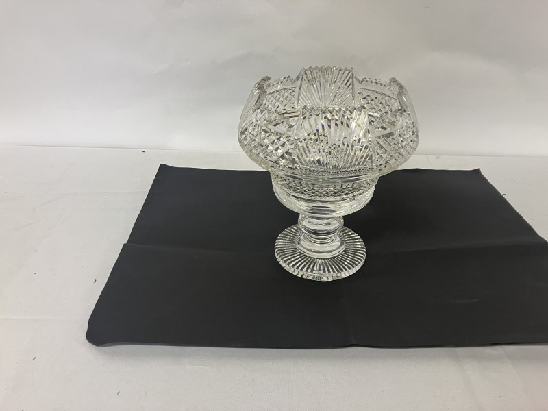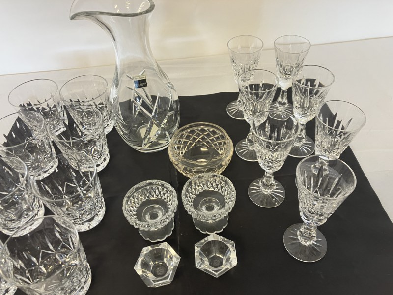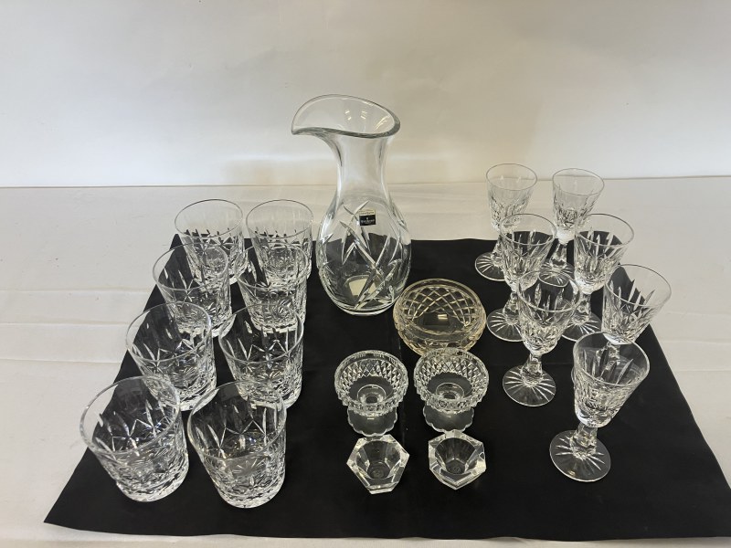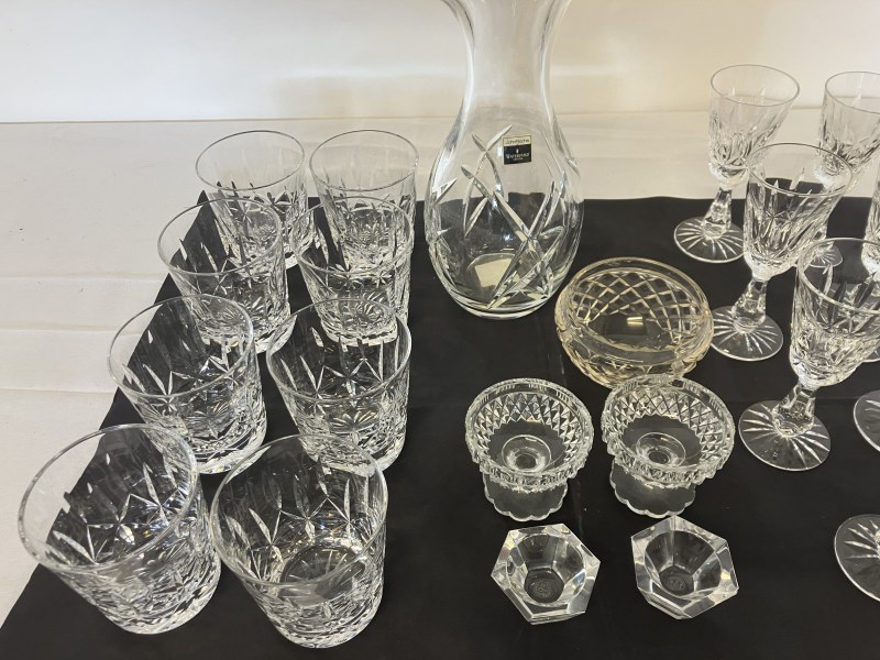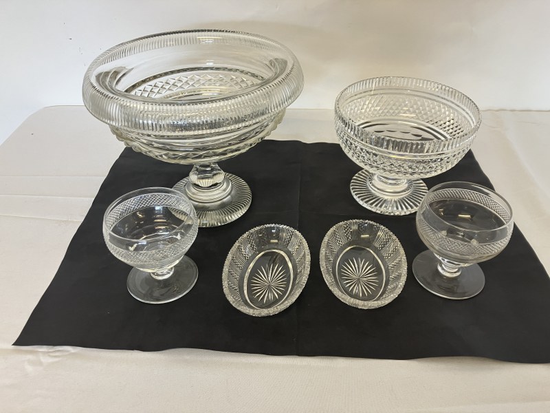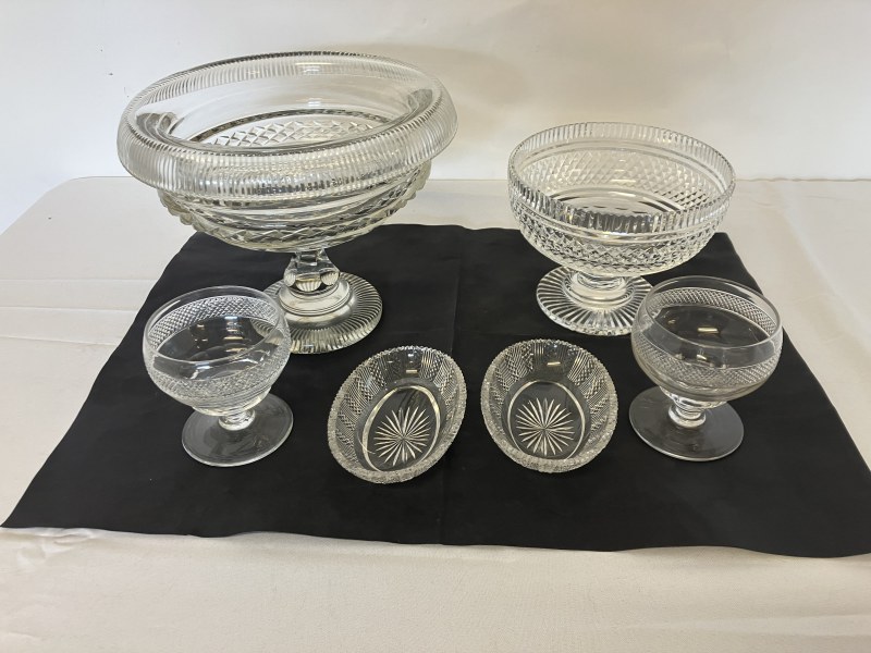 Large Waterford glass turnover bowl on circular base, medium size bowl, a pair of glasses and a pair of small dishes. (6)