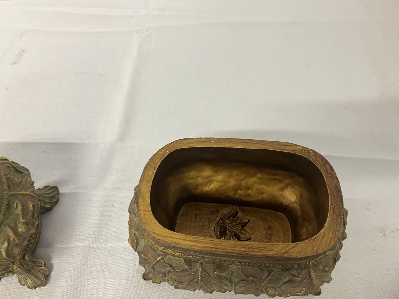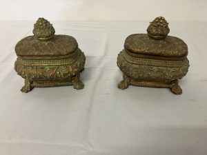 A pair of decorative gilt caskets complete with covers and raised on feet.