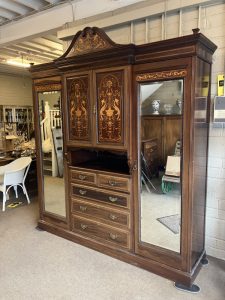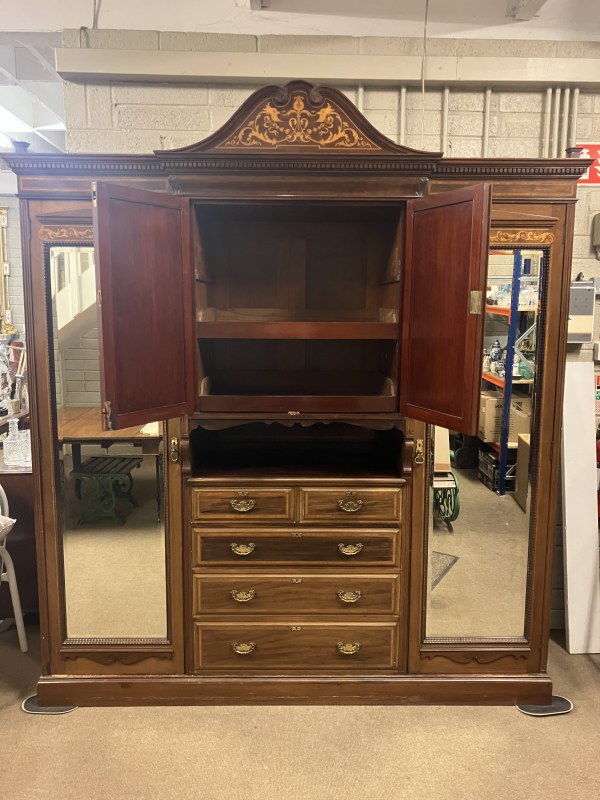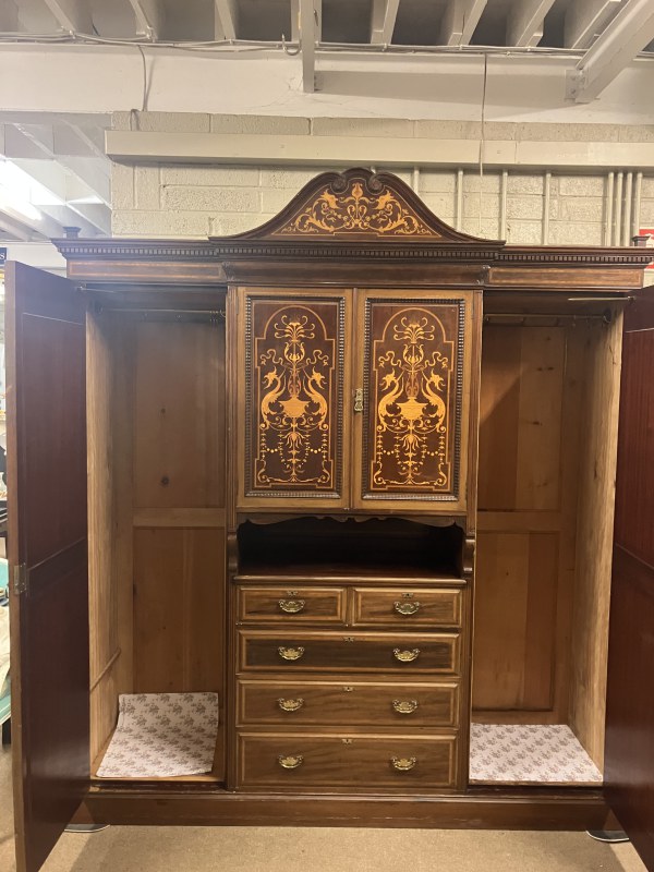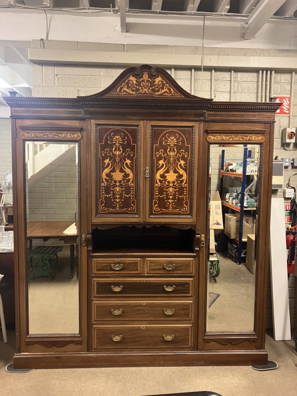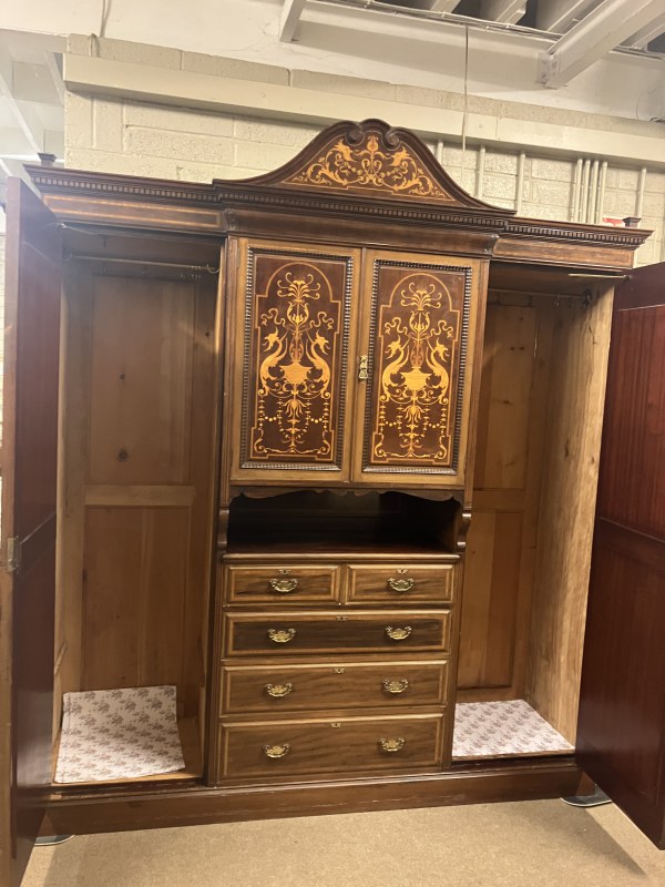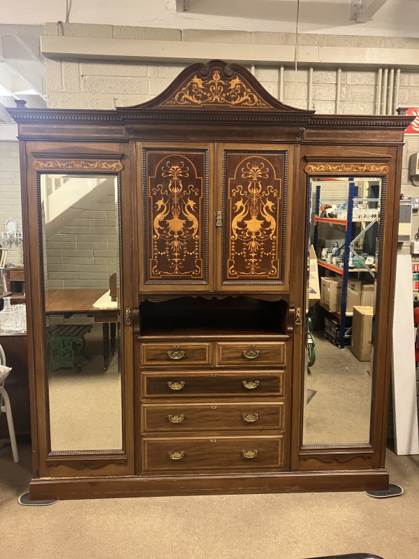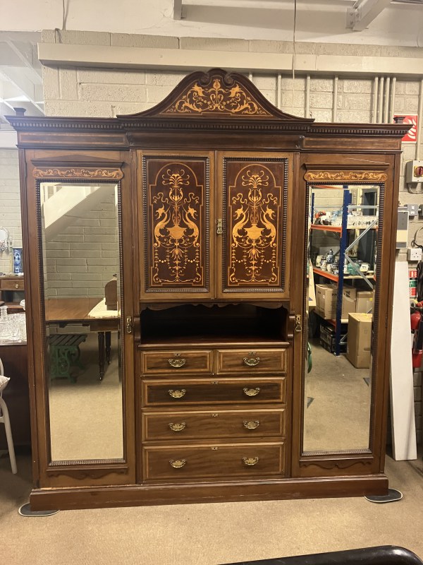 A fine antique inlaid mahogany triple section wardrobe, the dentil and inlaid cornice having 2 long mirror door having cupboards, the centre fitted with a 2 door linen press over chest of 2 short and 3 long drawers. W. 205cm, H. 250cm, D. 55cm approx.