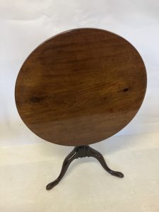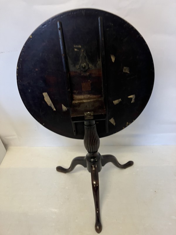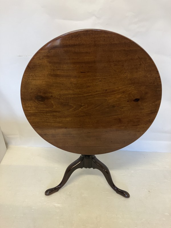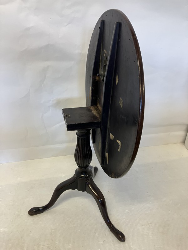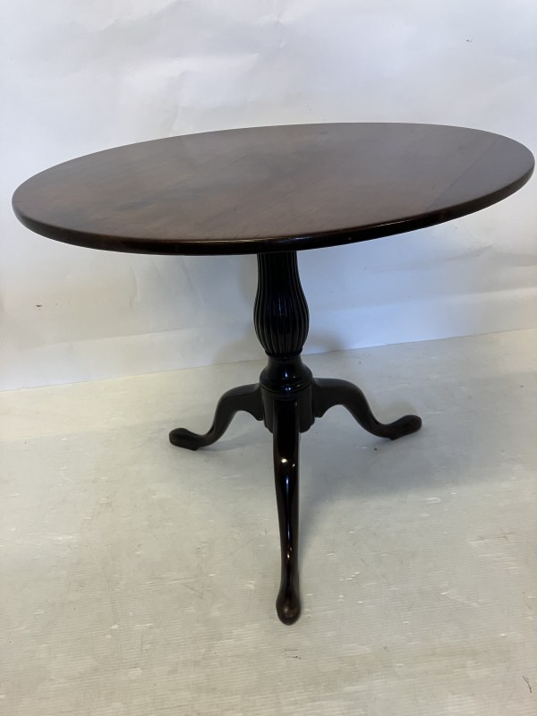 A good Georgian mahogany wine or tea table, the circular pod raised on fluted column and 3 pad feet. Diameter 83cm.