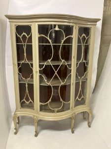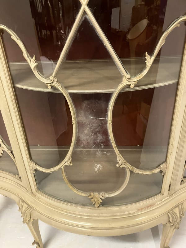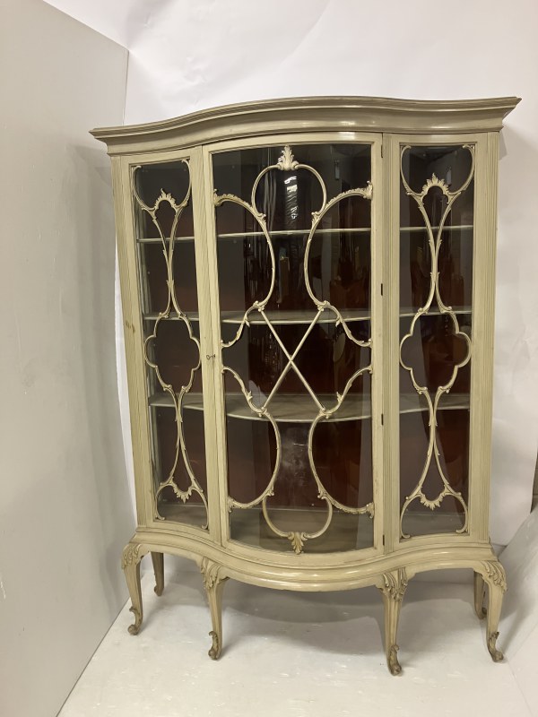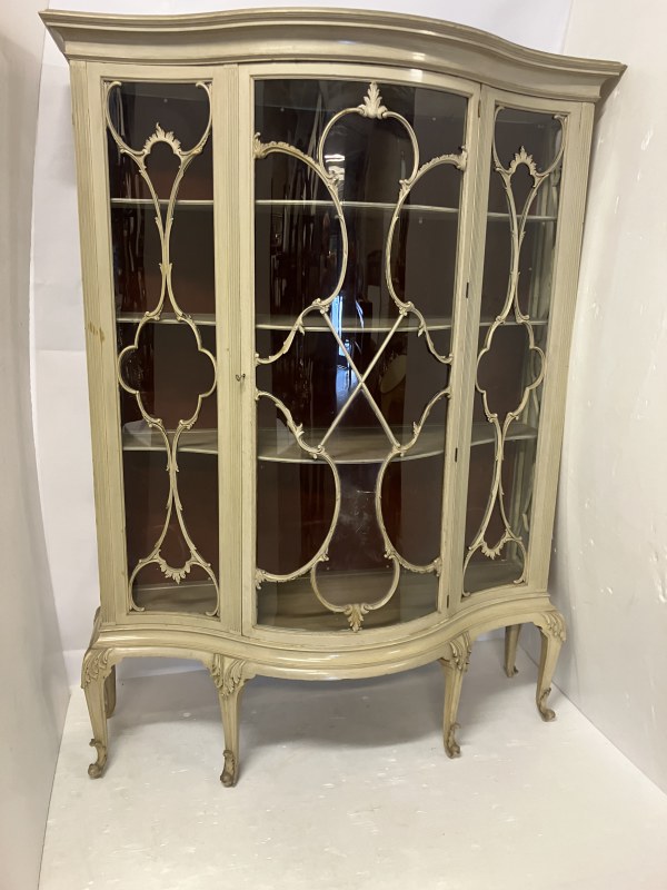 Fine antique painted drawing room cabinet of serpentine shape with decorative glazed door and side panels and raised on 6 cabriole legs with carved decoration. H. 203cm, W. 153cm, D. 60cm approx. (repair on one door panel)