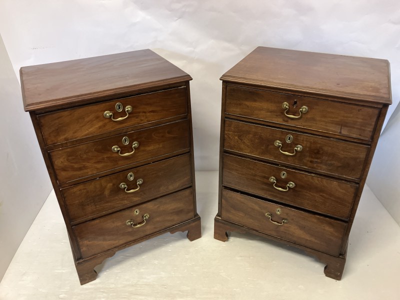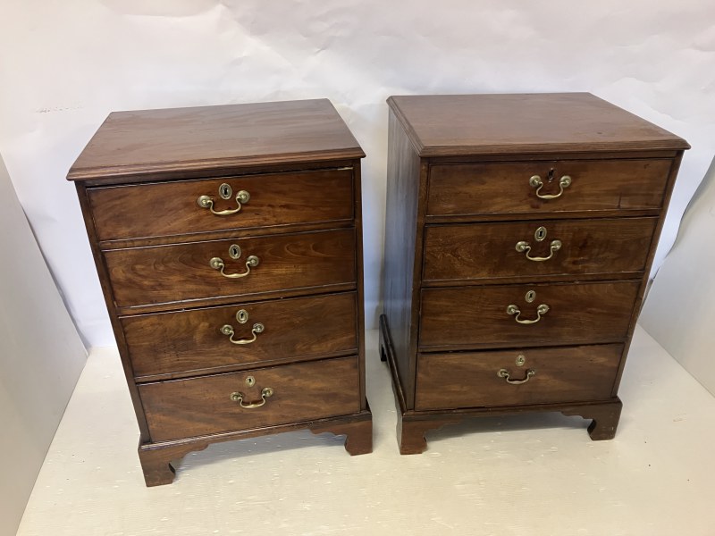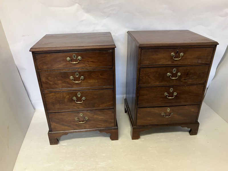 Pair of Georgian mahogany slim chests of 4 drawers having brass handles and raised on bracket feet. W. 66cm, D. 55cm, H. 98cm approx.