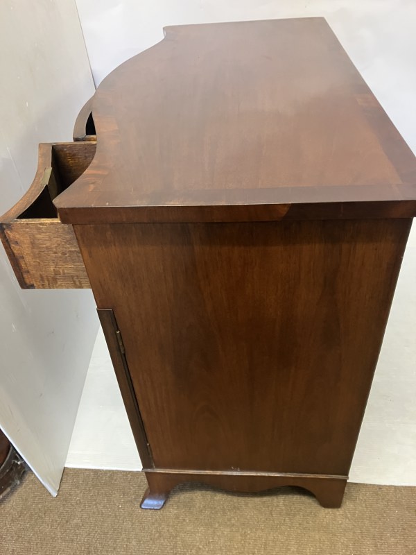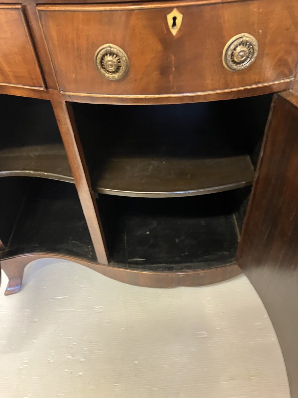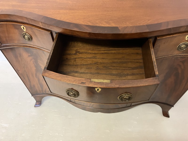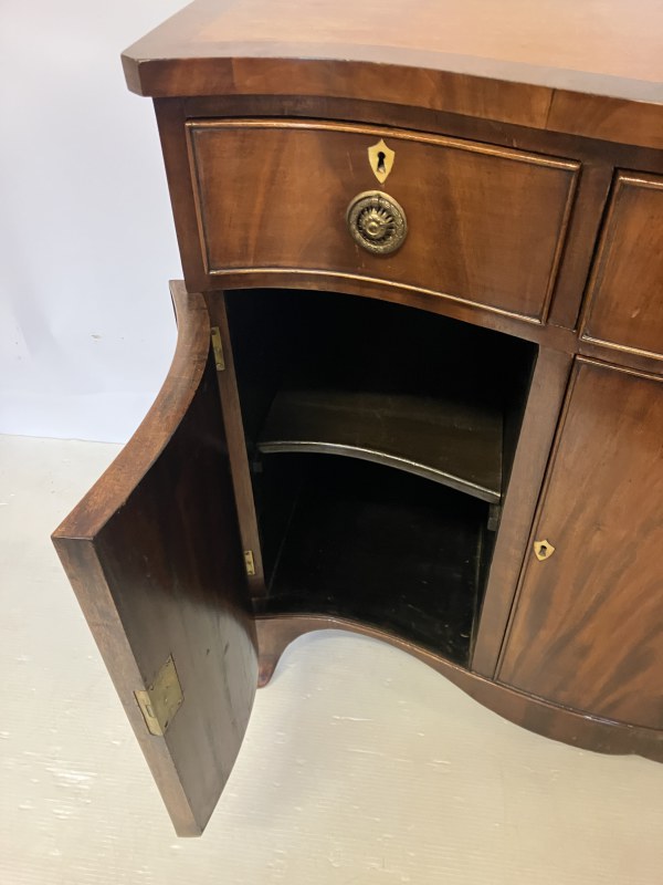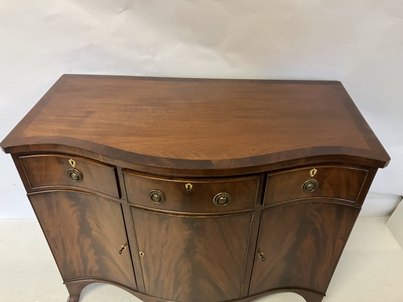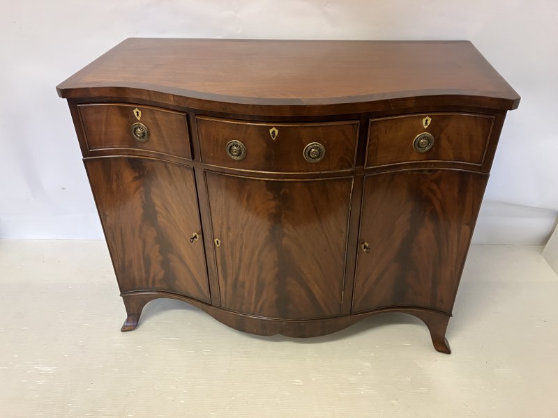 Antique mahogany side cabinet, the serpentine shaped top over 3 drawers and 3 cupboards and raised on splay feet. w. 107cm, D. 50cm, H. 85cm approx.