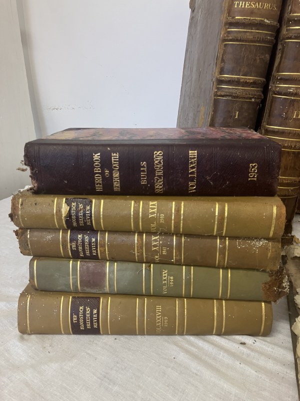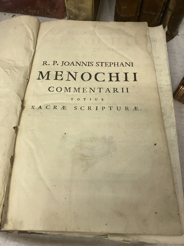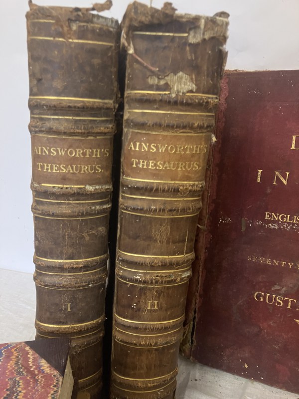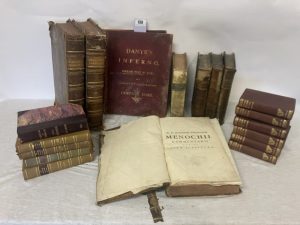A box of books as found to include Robert Ainsworth Thesaurus 2 vols; Dantes Inferno; Joannis Stephani - Menochii (2 vols in 1) and others, see photos.