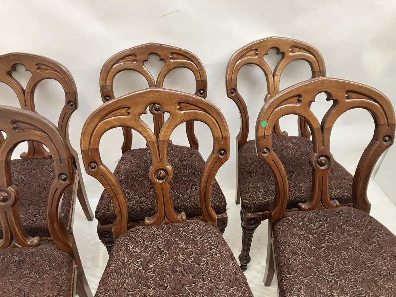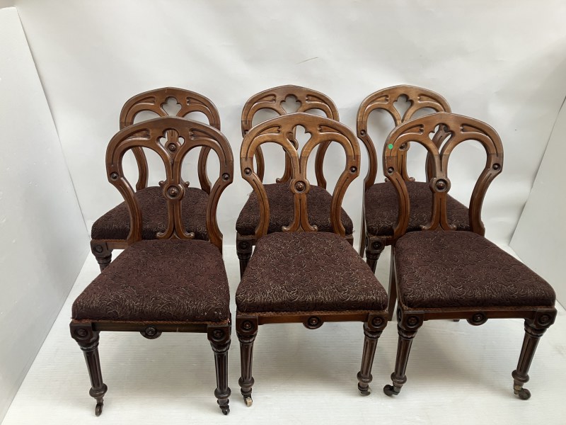 Set of 6 Victorian mahogany dining chairs having shaped backs and raised on fluted legs.