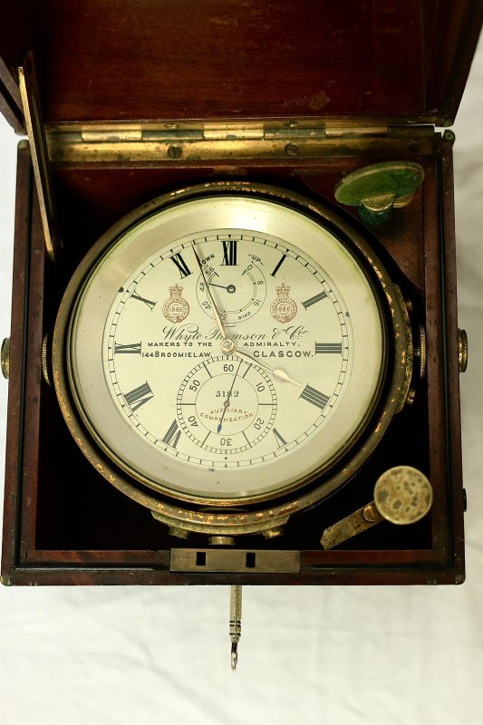 An antique 2 day marine chronometer Whyte, Thompson & Co. Makers to the admiralty Glasgow, housed in a mahogany case with brass inlay and brass side handles, the dial with seconds dial, up-down power reserve indicator. AF