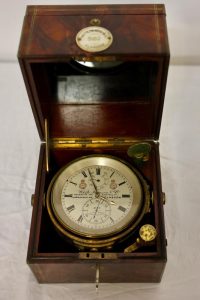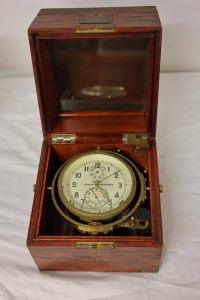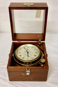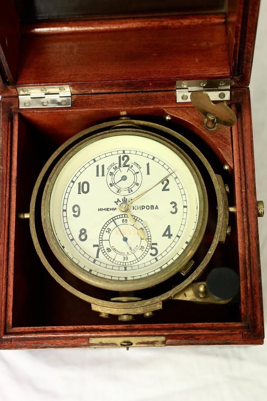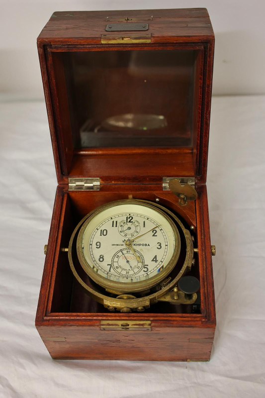 Russian marine two-day chronometer, manufactured by the 1st Moscow watch factory housed in a mahogany case with brass fittings. AF