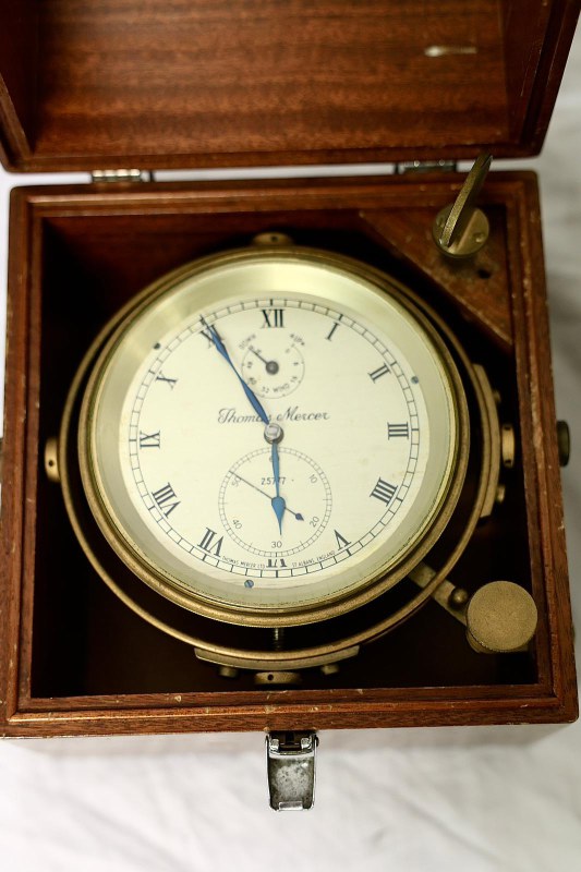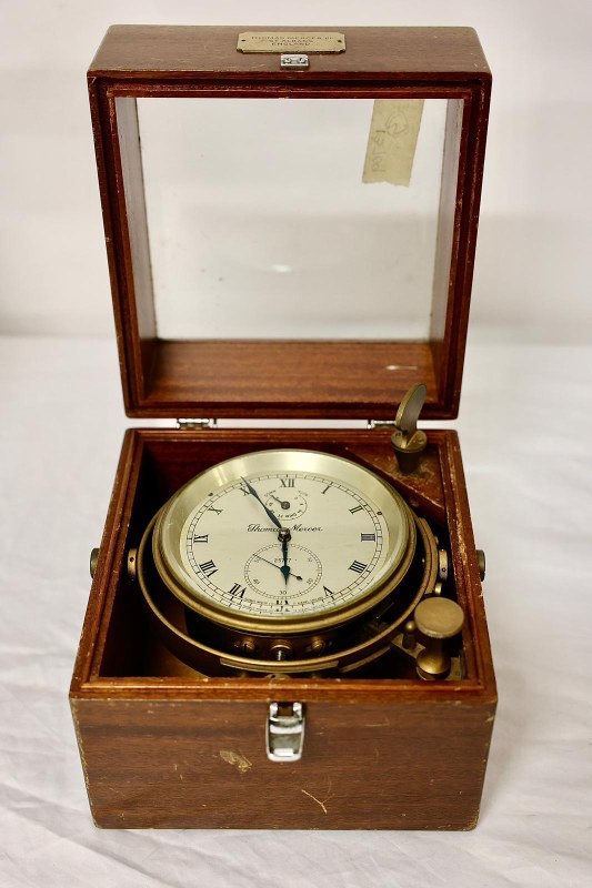 Antique Thomas Mercer marine chronometer, housed in a timber case, the dial with roman numerals and separate sub dials for seconds, minutes and hours. AF