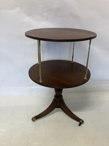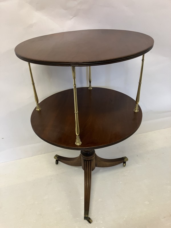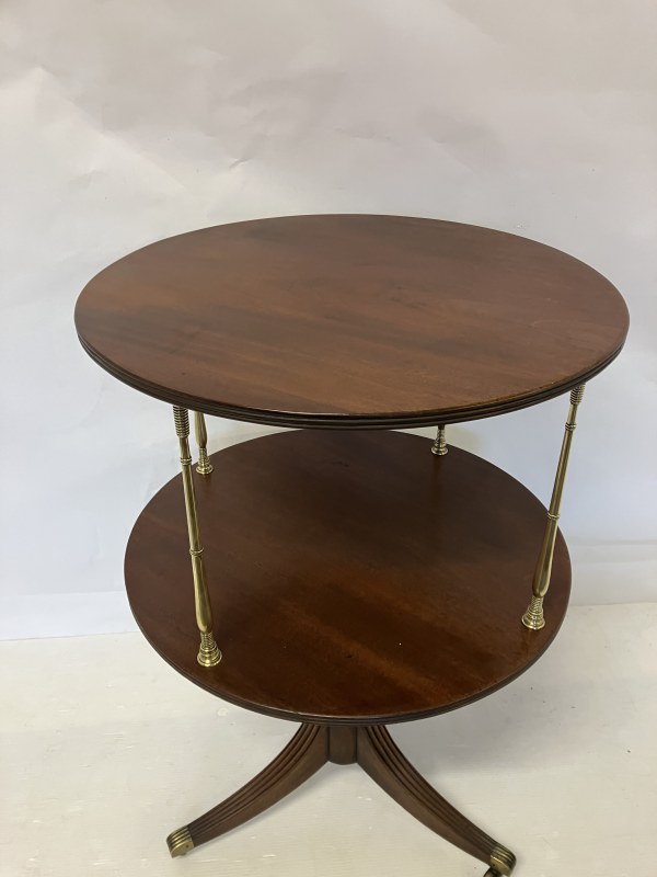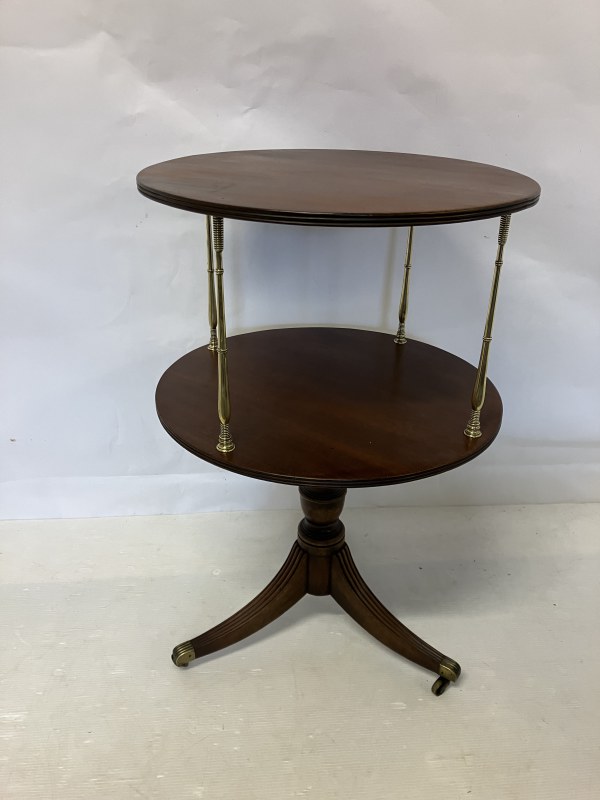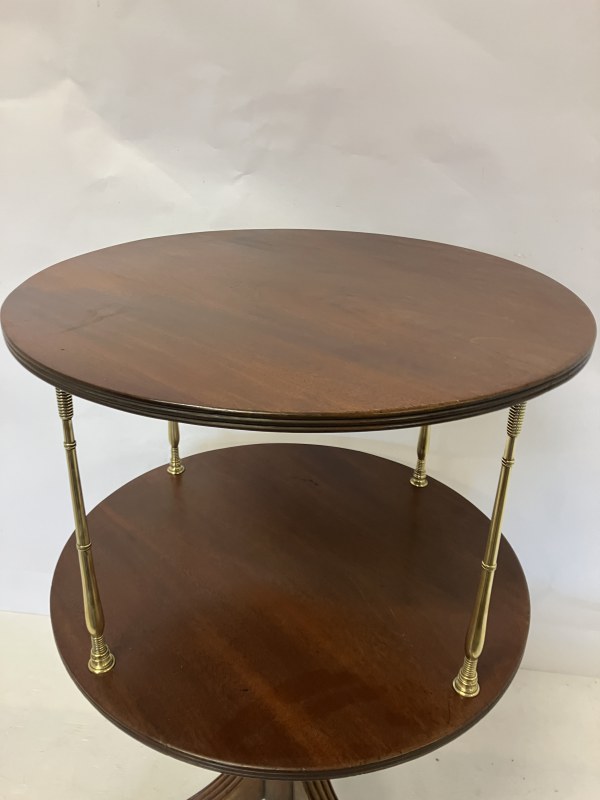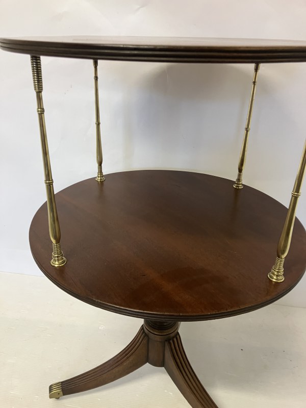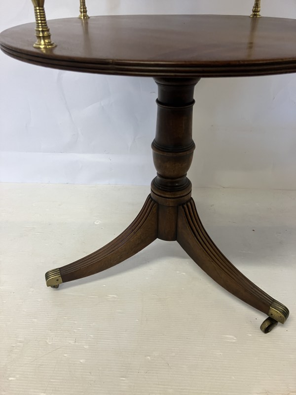 A Regency style mahogany dumbwaiter having 2 circular shelves with reeded decoration and supported by brass columns, raised on turned column with reeded splay feet and brass toe castors. H. 100cm, Diameter 66cm approx.
