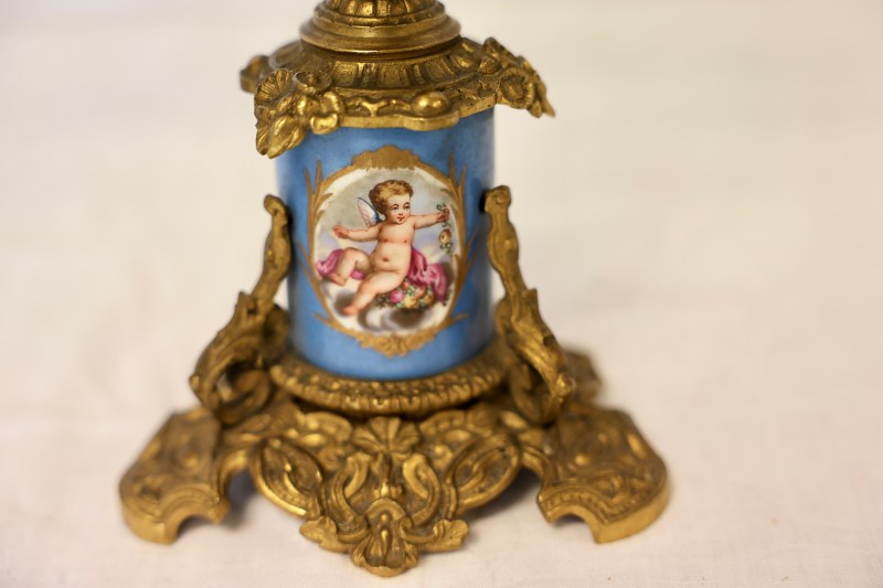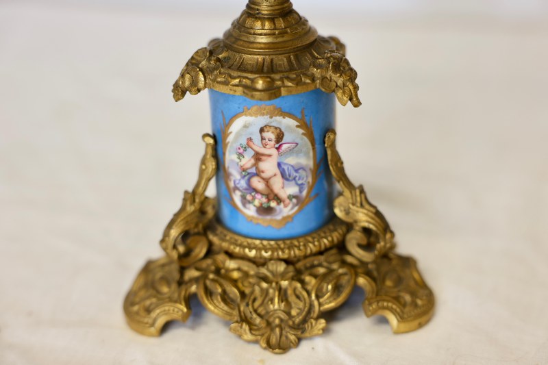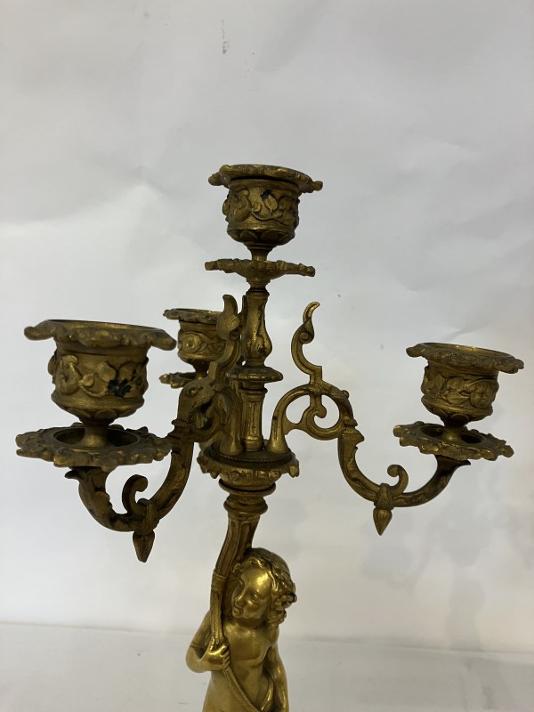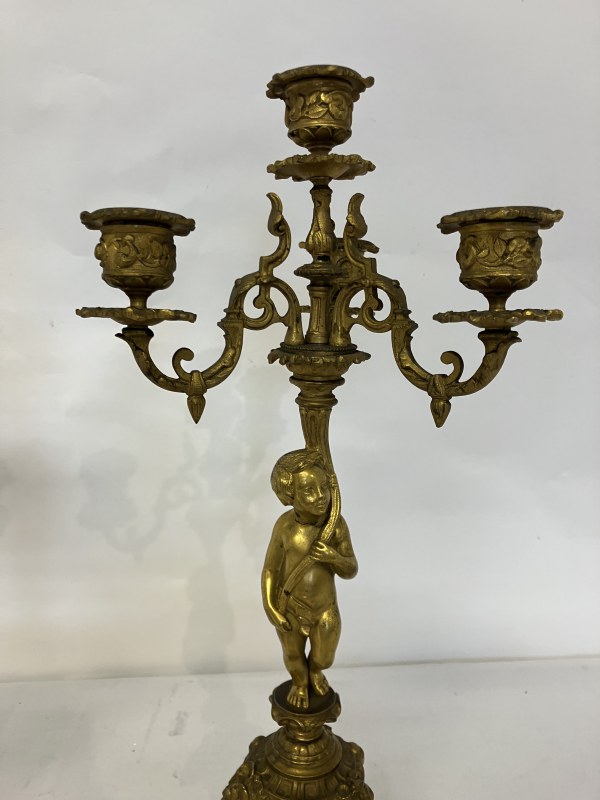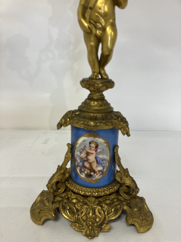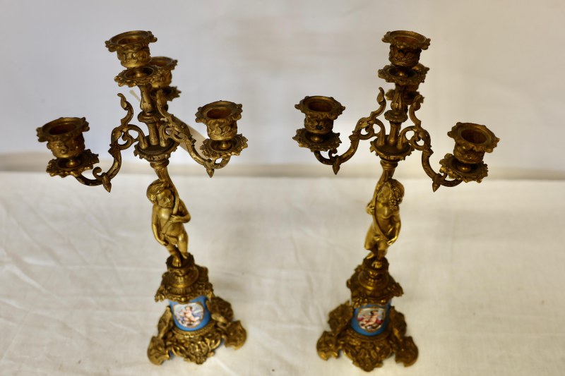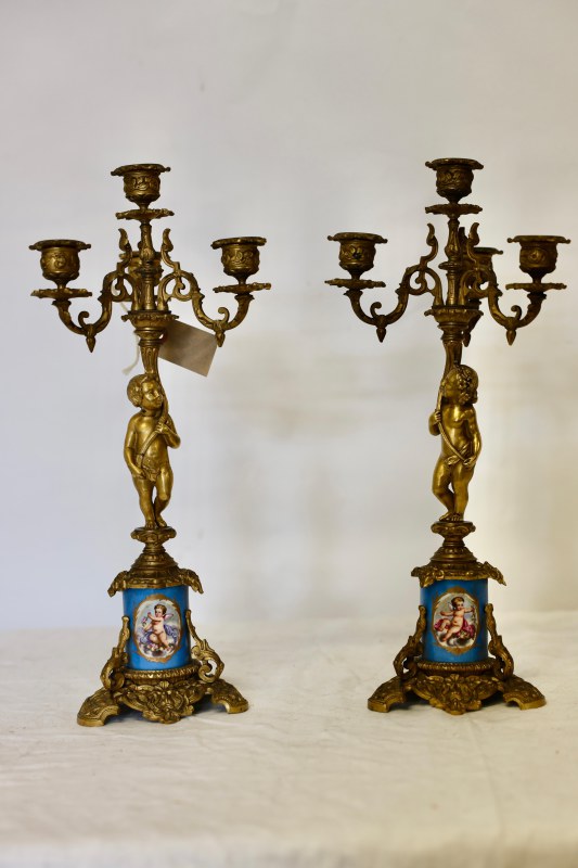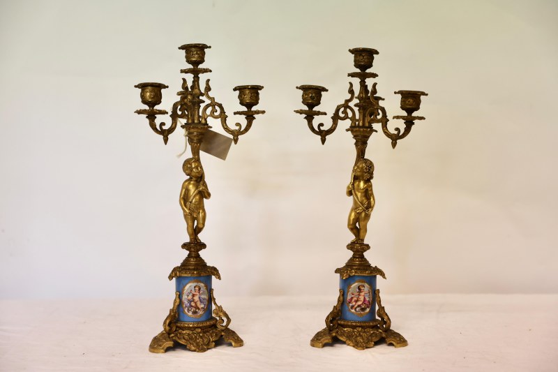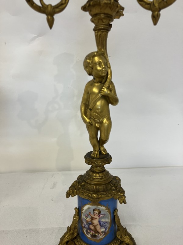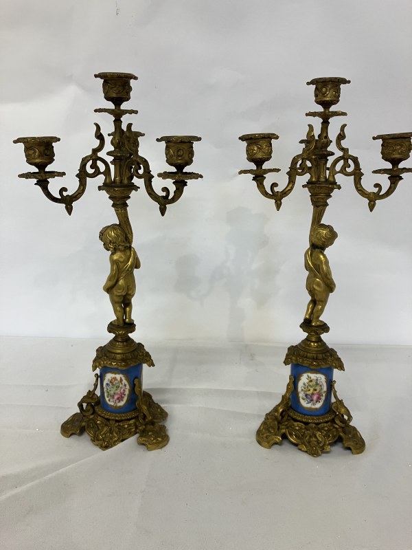 A good pair of antique gilded brass and French porcelain 3 branch candleabra. H. 45cm approcx.