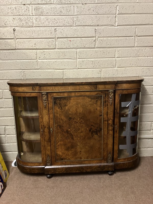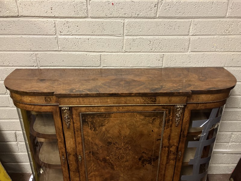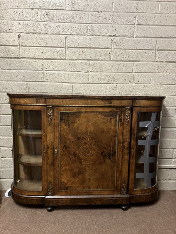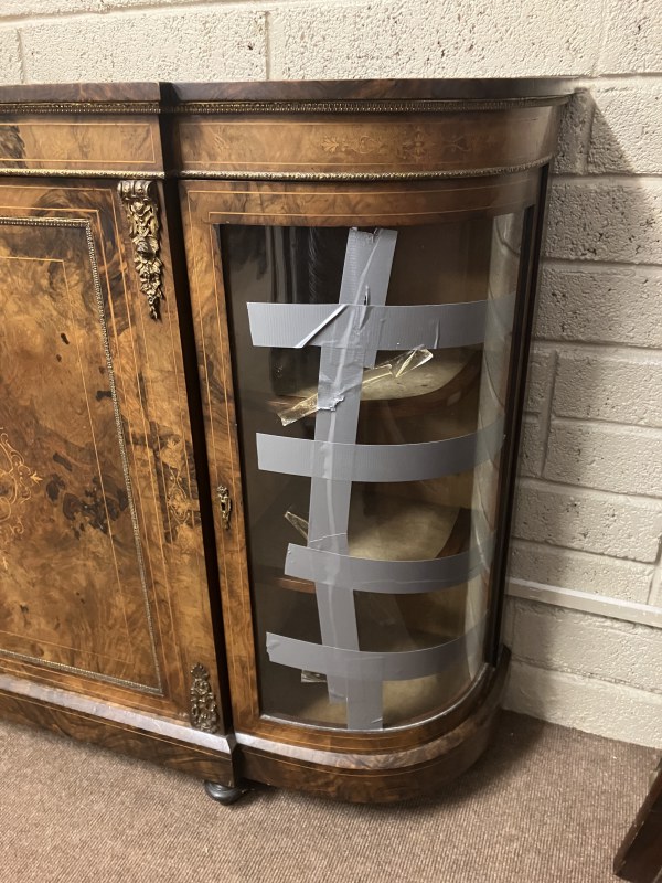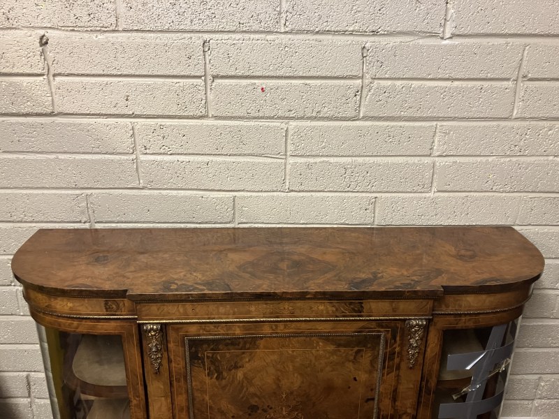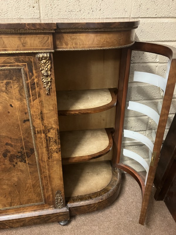 Victorian inlaid and brass mounted walnut credenza having curved glass doors. (one damaged). W. 122cm.