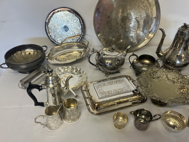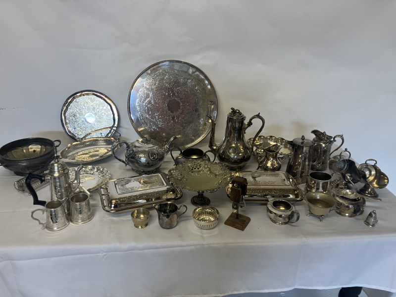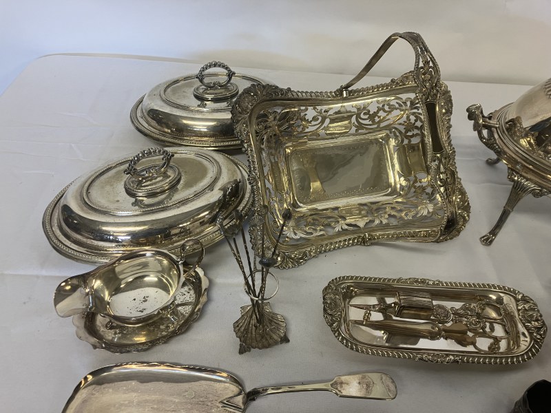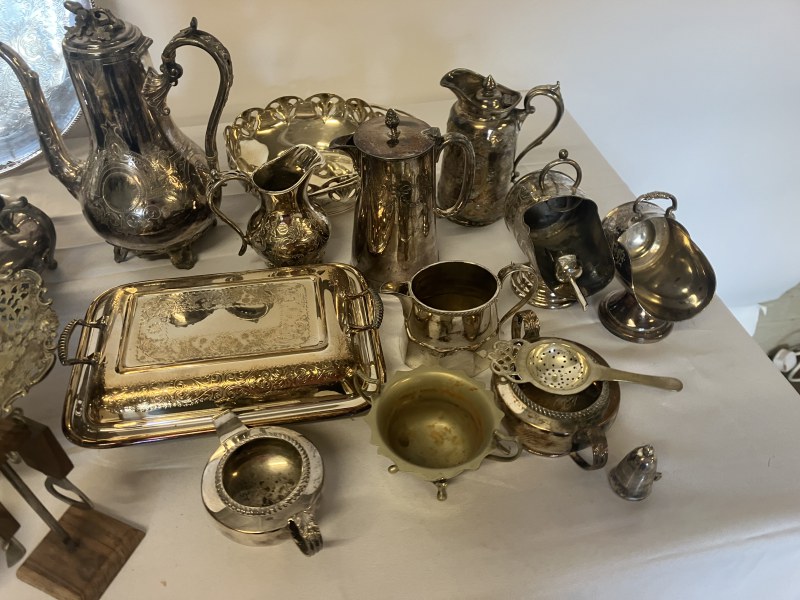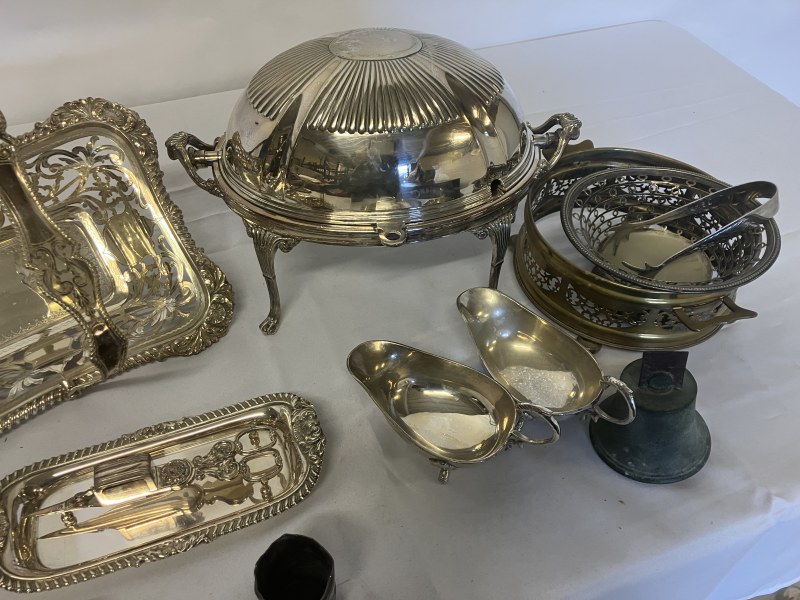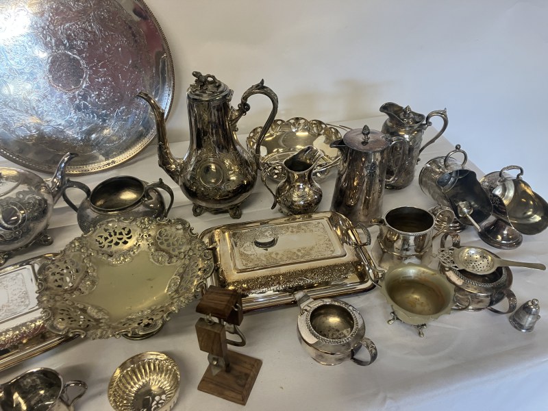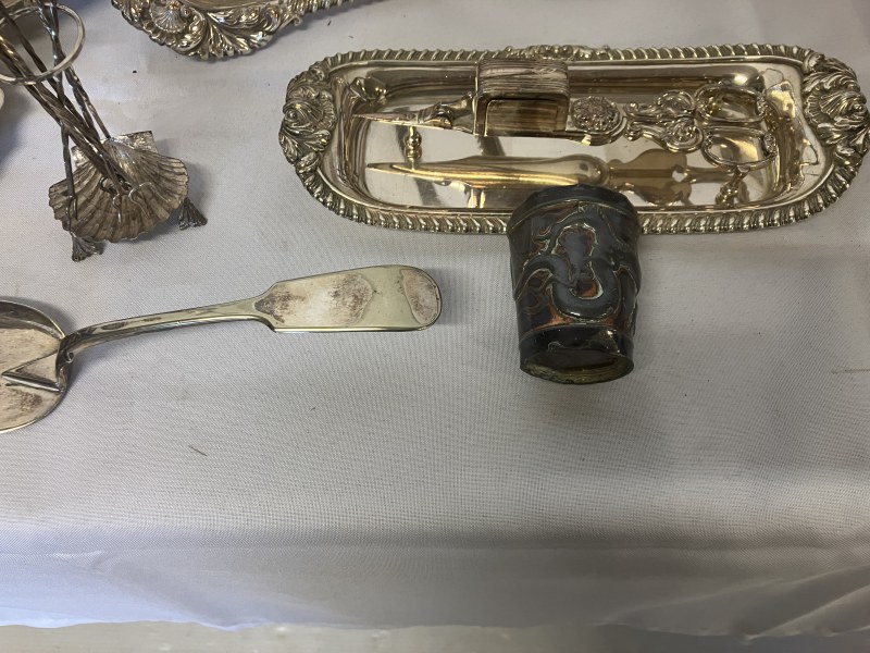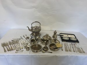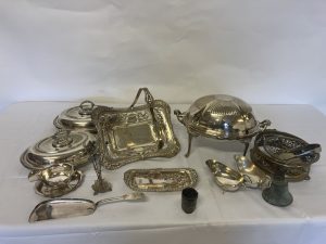 Lot of plated ware to include breakfast and entree dishes, candle snuffer and tray, etc.