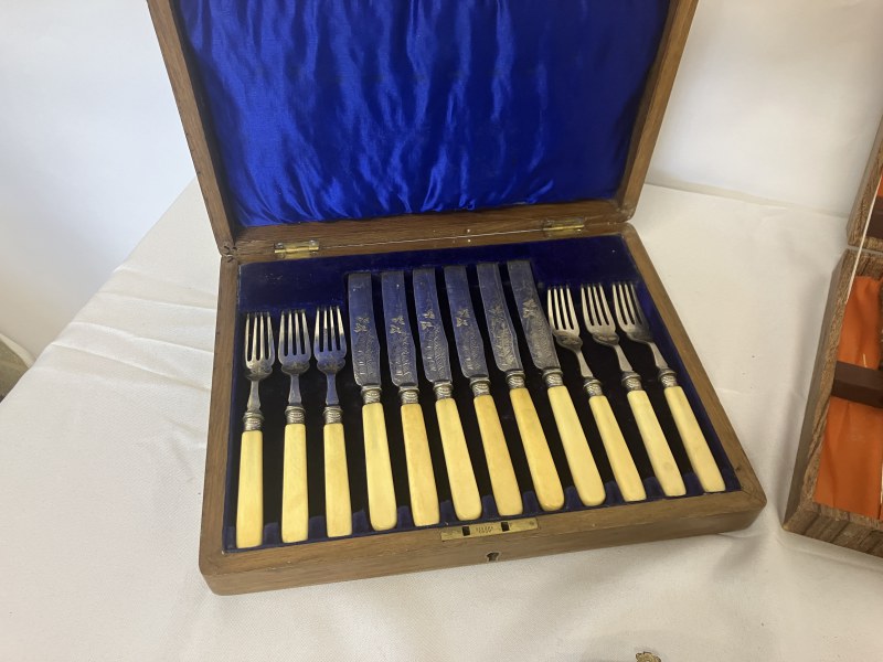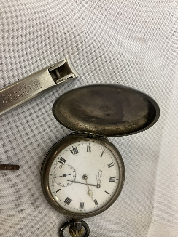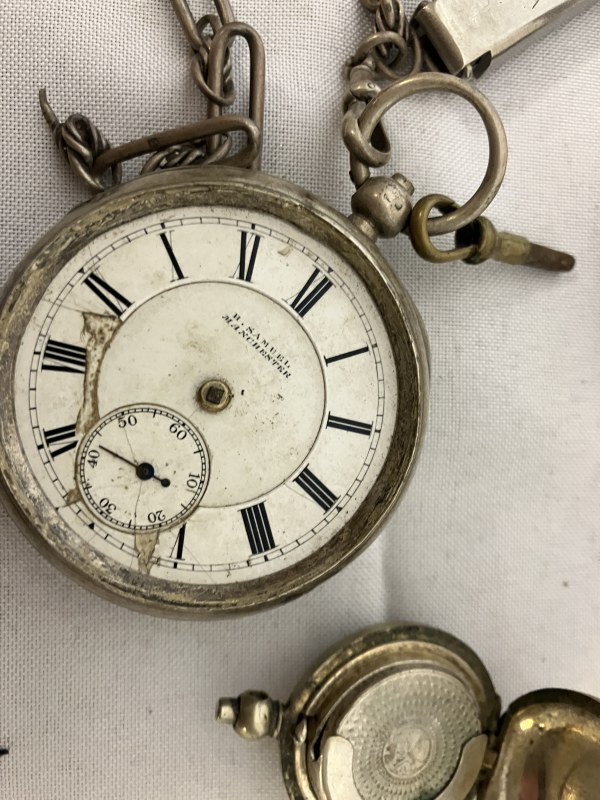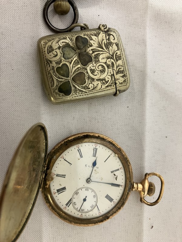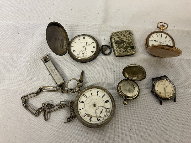 Lot of old pocket watches, one with silver case and chain, coin holder and match box. AF (2 boxes)