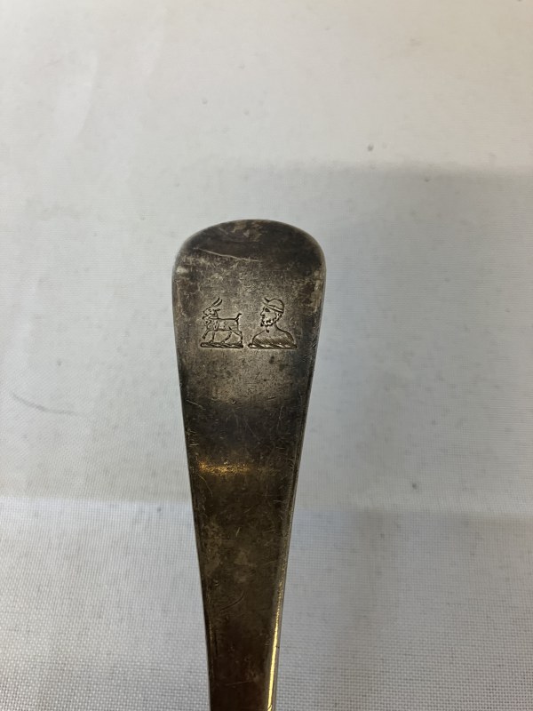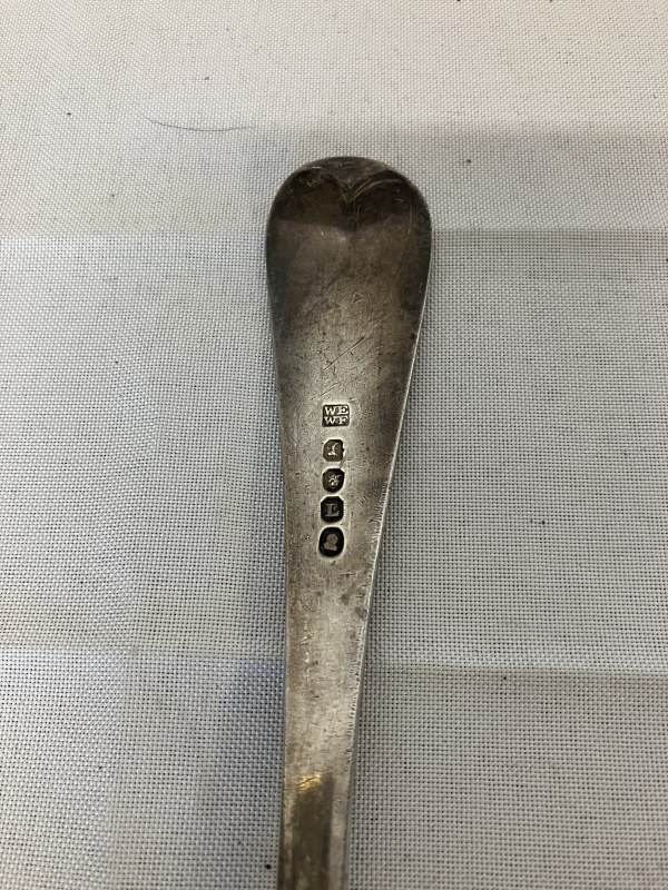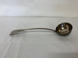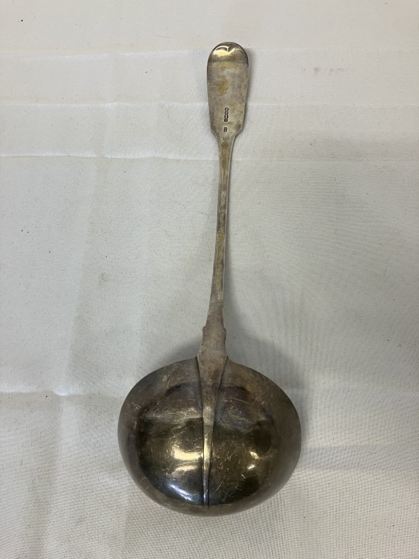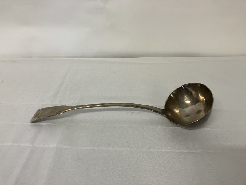 Large Irish silver ladle with rat tail decoration. Dublin 1841, makers initials W.G., 9 troy ozs.