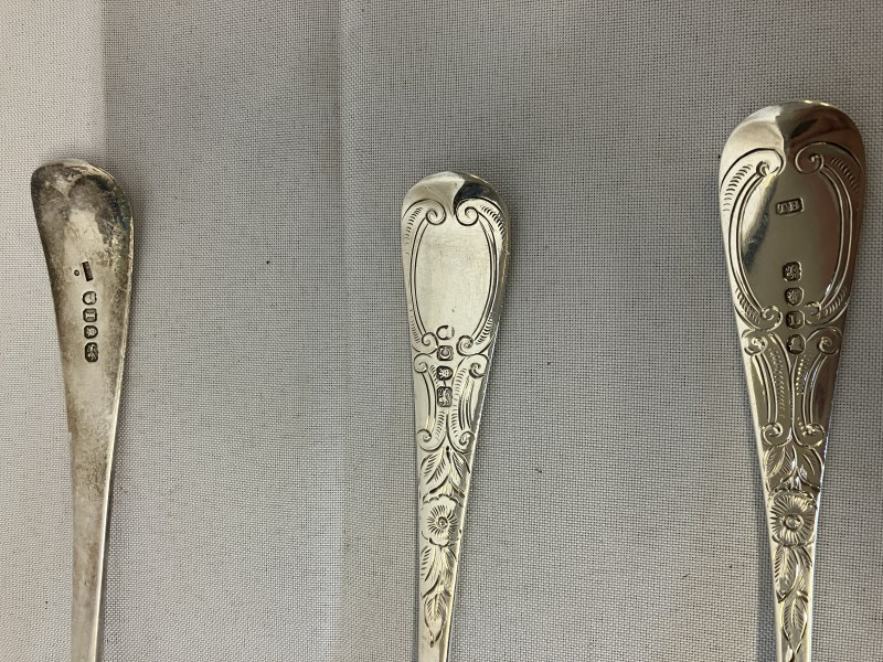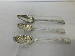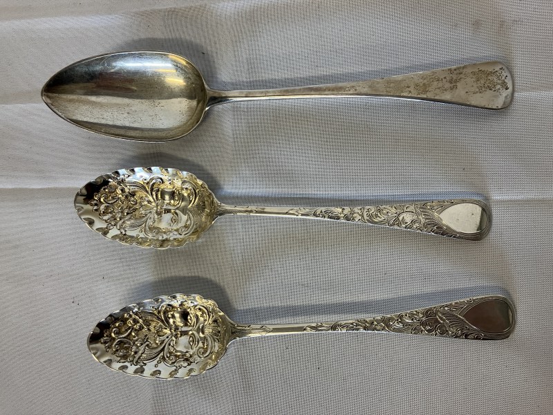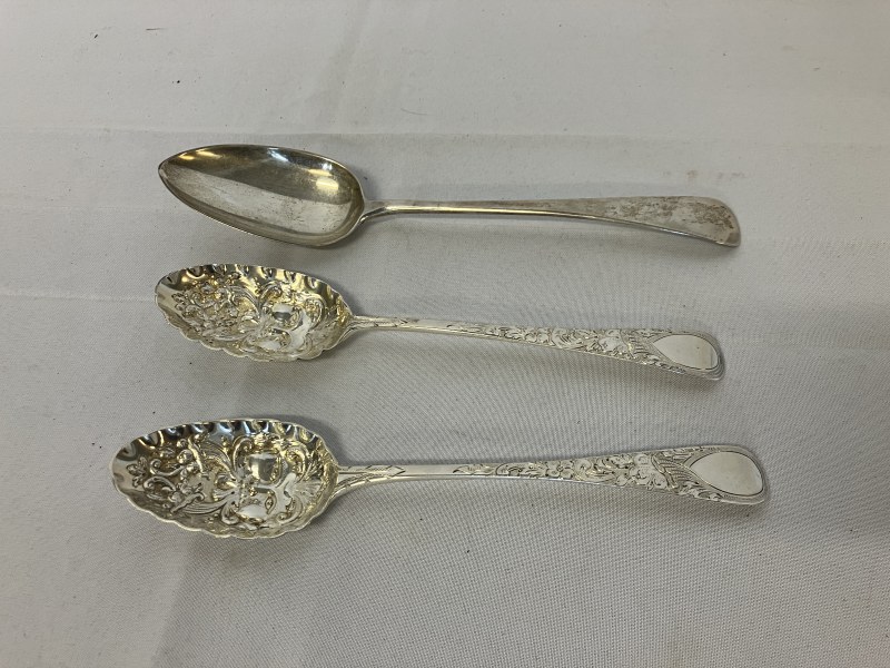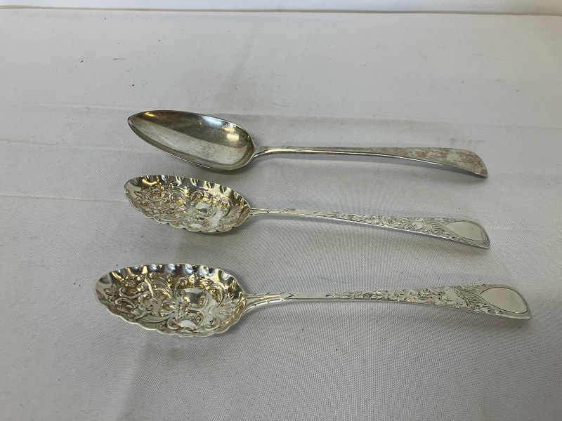 Two English silver berry spoons, London 1798 & 1806 4 troy ozs and an English silver tablespoon, London 1804 William Eley, 3 troy ozs. (3)