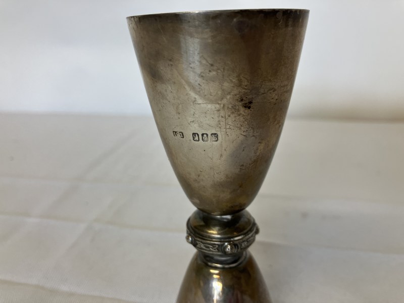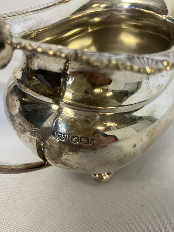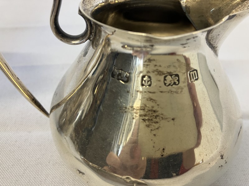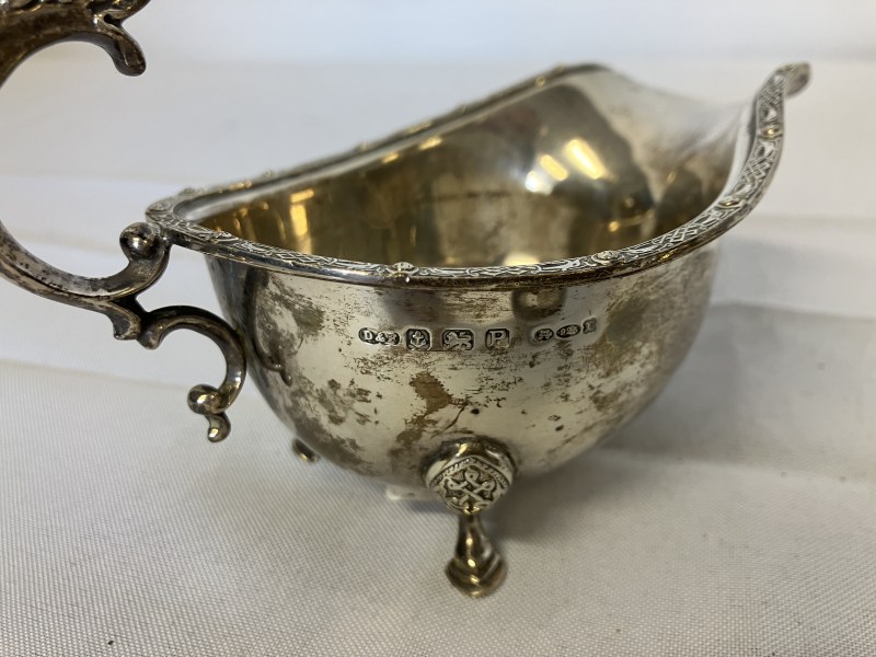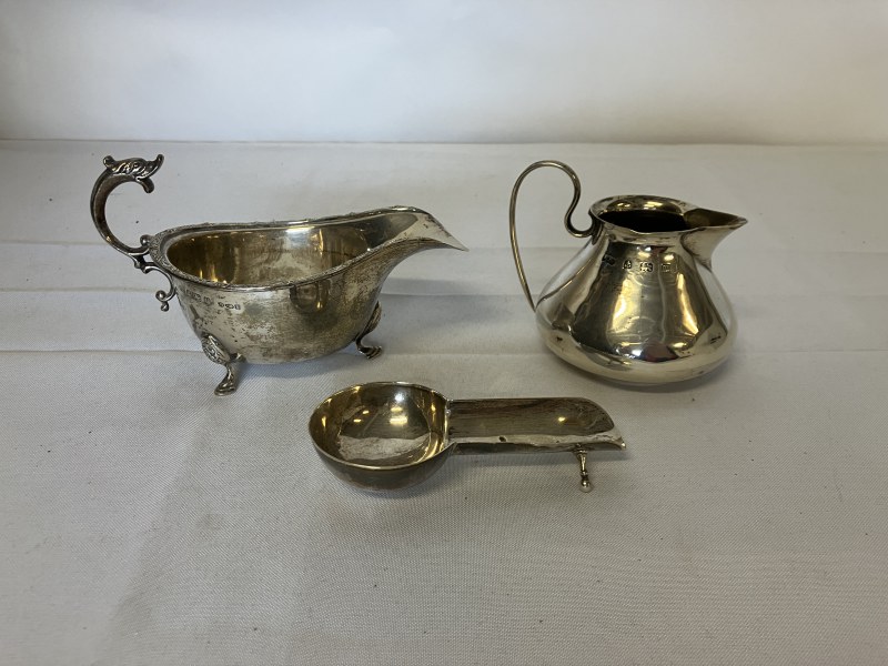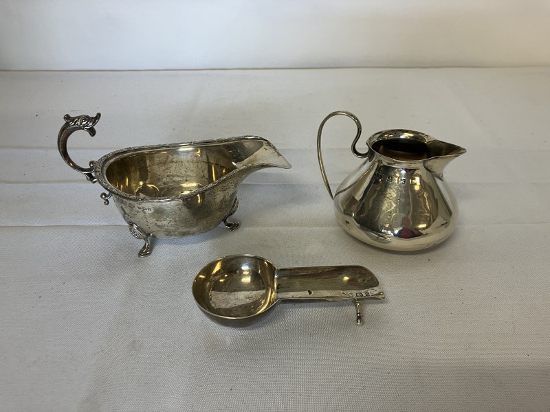 Mixed lot - small English silver milk jug, Birmingham 1911; silver sauce boat, Birmingham 1939; silver cigar rest/ashtray, Birmingham 1900, total weight 8 troy ozs.