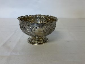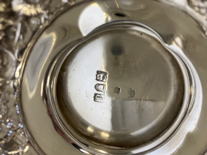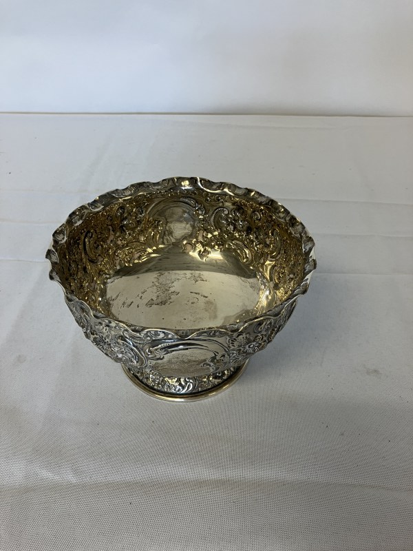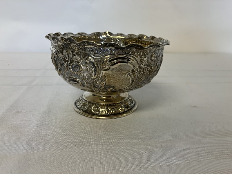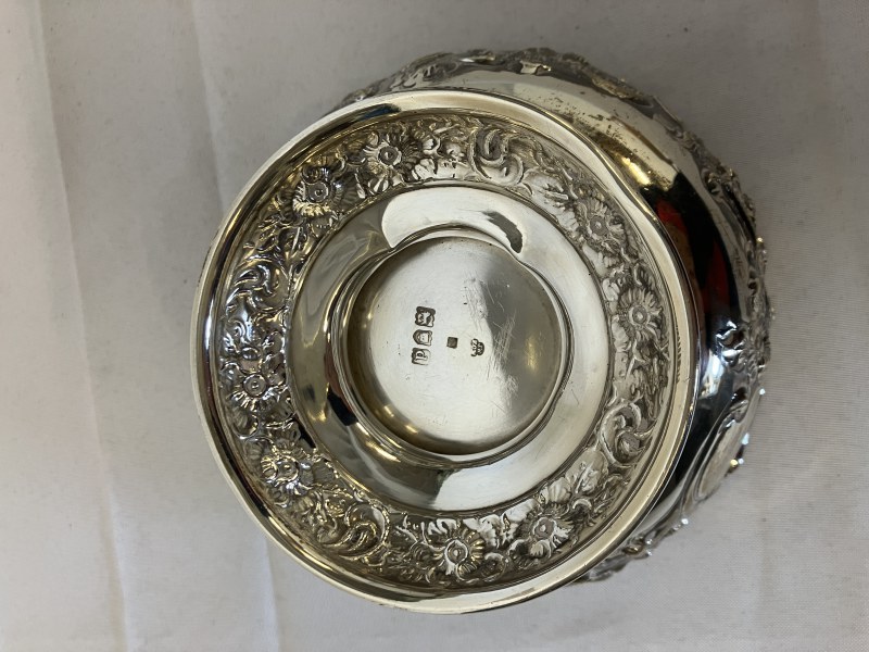 English silver embossed bowl on circular base, London 1899, 6 troy ozs.